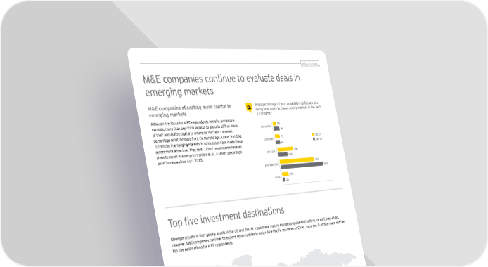 MM&&AA o ouuttllooookk M&E companies continue to evaluate deals in emerging markets M&E companies allocating more capital to Q: What percentage of your acquisition capital are you emerging markets going to allocate to the emerging markets in the next 12 months? Although the focus for M&E respondents remains on mature markets, more than one-third expects to allocate 10% or more Above 50% 5% of their acquisition capital to emerging markets — a seven 9% percentage point increase from six months ago. Lower trending 7% Oct 15 currencies in emerging markets in some cases have made these 25%—50% Apr 15 assets more attractive. That said, 10% of respondents have no 6% plans to invest in emerging markets at all, a seven percentage 10%—25% 24% point increase since April 2015. 14% Less than 10% 54% 68% None 10% 3% Top fi ve investment destinations Stronger growth in high-quality assets in the US and the UK make these mature markets popular destinations for M&E executives. However, M&E companies continue to explore opportunities in major Asia-Pacifi c countries as China, India and Australia round out the top fi ve destinations for M&E respondents. Top destinations China United States United Kingdom India Australia Capital Confi dence Barometer | 13