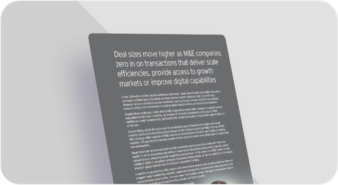 Deal sizes move higher as M&E companies zero in on transactions that deliver scale effi ciencies, provide access to growth markets or improve digital capabilities In the 13th edition of the Capital Confi dence Barometer, media and entertainment (M&E) executives are more confi dent about the global economy and key market indicators than 12 months ago. However, various cyclical and secular headwinds, such as foreign currency volatility and earnings pressure arising from the industry’s ongoing digital transformation, are tempering enthusiasm. Despite these challenges, nearly 60% of M&E respondents expect their company to actively pursue acquisitions in the next 12 months, an increase of 20 points compared to a year ago. Further, confi dence in deal fundamentals, particularly the number and quality of acquisition opportunities, is on the rise. Unsurprisingly, digital disruption and the accelerating pace of business innovation and market evolution continue to have the greatest impact on the strategic outlook for M&E. In terms of their M&A strategy, while a quarter of M&E executives are looking to strengthen positioning in existing markets, 75% say they’ll be looking outside of their sector to access new technologies or expand into new end-markets. Target deal sizes are moving higher as M&E companies explore acquisitions that will “move the needle” in terms of growing scale (often in response to transactions announced by industry peers/ competitors) or enhancing digital capabilities and presence. At the same time, M&E leaders remain mindful of shifts in valuations compared to business fundamentals, as well as conditions in the equity and debt capital markets that are critical to acquisition funding. In addition to acquisitions, M&E players with diversifi ed businesses are reviewing their portfolios on a regular basis to determine whether capital and management resources are being allocated to the most promising opportunities. In some cases, the strategic review will lead to transactions that re- shape the portfolio and re-position the company for future growth. As M&E executives look forward, they overwhelmingly expect the global M&A market to remain strong in the year ahead. To thrive in an era of rapid industry change where scale is often a key advantage, an active M&A strategy will complement execution in the core. Finally, I would like to recognize Tom Connolly, who is retiring from EY in December 2015 after more than 20 years of dedicated service to our clients and the organization. Tom was instrumental in building EY’s M&E practice, and is a friend and mentor to many across our organization and throughout the industry. We will miss Tom and wish him the best in his retirement. John Harrison Global Leader, Media & Entertainment Transaction Advisory Services Capital Confi dence Barometer | 3