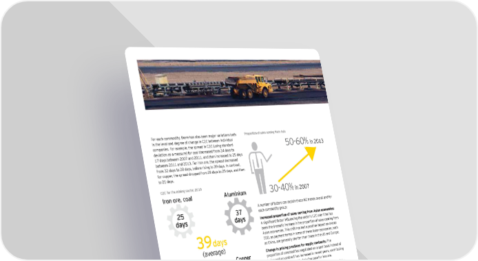 For each commodity, there has also been major variations both Proportion of sales coming from Asia in the level and degree of change in C2C between individual companies. For example, the spread in C2C (using standard 50-60%in 2013 deviation as a measure) for coal decreased from 24 days to 17 days between 2007 and 2011, and then increased to 25 days between 2011 and 2013. For iron ore, the spread decreased from 32 days to 28 days, before rising to 39 days. In contrast, for copper, the spread dropped from 29 days to 25 days, and then to 21 days. C2C for the mining sector, 2013 Iron ore, coal Aluminium 30-40%in 2007 25 A number of factors can explain these WC trends overall and for days 37 each commodity group: days Increased proportion of sales coming from Asian economies: 9ka_faÕ[Yfl^Y[lgjafÖm]f[af_l`]k][lgjÌk;*;gn]jlae]`Yk been the dramatic increase in the proportion of sales coming from days Asian economies. This shift has had a positive impact on overall 39 DSO, as payment terms in some of these Asian economies, such (average) as China, are generally shorter than those in the US and Europe. Gold Copper Change in pricing practices for supply contracts: The proportion of commodities negotiated on a spot basis instead of being sold on contract has increased in recent years, contributing to lower DSO. This is particularly the case for iron ore. 48 Increased exposure to commodity trading: A number of mining 51 companies have set up trading arms in recent years, adopting days days some of the strategies used by the big commodity trading houses to make money by exploiting different prices for products in different parts of the world. This increased exposure to trading which generally carries short trade terms has also contributed to lower DSO. 5 Cash in the ground: working capital management in the mining sector