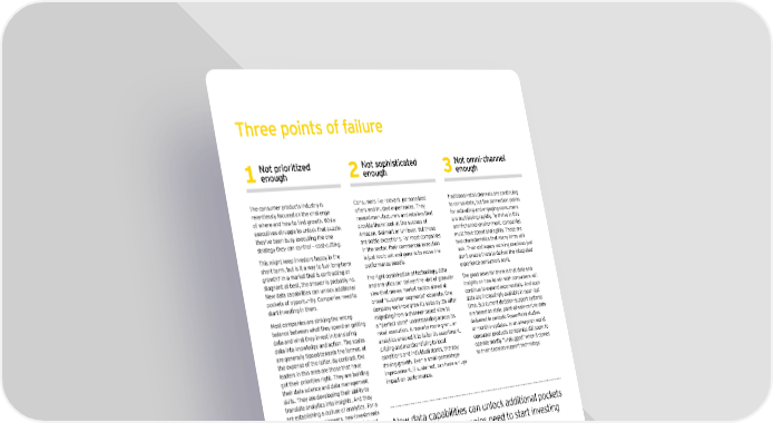 Three points of failure Not prioritized Not sophisticated Not omni-channel enough enough enough The consumer products industry is Consumers like relevant, personalized Traditional retail channels are continuing relentlessly focused on the challenge offers and trusted experiences. They to consolidate, but the connection points of where and how to find growth. While reward manufacturers and retailers that for activating and engaging consumers executives struggle to unlock that puzzle, provide them: look at the success of are multiplying rapidly. To thrive in this they’ve been busy executing the one Amazon, Walmart or Unilever. But these omni-channel environment, companies strategy they can control — cost-cutting. are noble exceptions. For most companies must have speed and agility. Those are This might keep investors happy in the in the sector, their commercial execution two characteristics that many firms still short term, but is it a way to fuel long-term is just too blunt and generic to move the lack. Their old legacy working practices just growth? In a market that is contracting or performance needle. don’t enable them to deliver the integrated stagnant at best, the answer is probably no. The right combination of technology, data experience consumers want. New data capabilities can unlock additional and analytics can deliver the kind of granular The good news for them is that data and pockets of opportunity. Companies need to view that makes market tactics aimed at insights on how to win with consumers will start investing in them. broad “customer segments” obsolete. One continue to expand exponentially. And such Most companies are striking the wrong company we know grew its sales by 3% after data are increasingly available in near-real balance between what they spend on getting migrating from a channel-based view to time. But current decision-support systems data and what they invest in translating a “perfect store” understanding across its are based on stale, point-of-sale-centric data data into knowledge and action. The scales retail execution. A move to more granular delivered in periodic PowerPoint studies are generally tipped towards the former, at analytics enabled it to tailor its assortment, or monthly updates. In an always-on world, the expense of the latter. By contrast, the pricing and merchandising to local consumer products companies still seem to leaders in this area are those that have conditions and individual stores, thereby operate mostly “unplugged” when it comes got their priorities right. They are building driving growth. Even a small percentage to their decision-support technology. their data science and data management improvement, if sustained, can have a huge skills. They are developing their ability to impact on performance. translate analytics into insights. And they are establishing a culture of analytics. For a handful of these pioneers, new investments in data and analytics are a purposeful part New data capabilities can unlock additional pockets of their growth strategy, elevated beyond market research and insights. of opportunity. Companies need to start investing in them. Consumer Analytics | Point-of-view 3