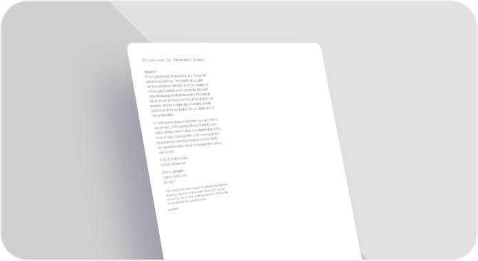 EY | Assurance | Tax | Transactions | Advisory About EY EY is a global leader in assurance, tax, transaction and advisory services. The insights and quality services we deliver help build trust and confidence in the capital markets and in economies the world over. We develop outstanding leaders who team to deliver on our promises to all of our stakeholders. In so doing, we play a critical role in building a better working world for our people, for our clients and for our communities. EY refers to the global organization, and may refer to one or more, of the member firms of Ernst & Young Global Limited, each of which is a separate legal entity. Ernst & Young Global Limited, a UK company limited by guarantee, does not provide services to clients. For more information about our organization, please visit ey.com. © 2015 EYGM Limited. All Rights Reserved. EYG no. EN0688 1504-1444611 NY ED 1607 This material has been prepared for general informational purposes only and is not intended to be relied upon as accounting, tax, or other professional advice. Please refer to your advisors for specific advice. ey.com