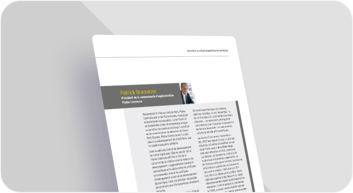Comment la culture transforme les territoires Patrick Braouezec Président de la communauté d’agglomération Plaine Commune Gladieu . © S Rassemblant 9 villes au nord de Paris, Plaine De nombreuses fabriques culturelles et Commune est un territoire-monde, marqué par créatives, hybrides, s’y sont implantées – le la jeunesse de sa population. Le territoire vit 6B, la Villa mais d’ici, la Briche foraine, Mains un dynamisme urbain et économique unique. d’œuvres... Les expressions artistiques et Le carrefour de communication qu’il constitue culturelles les plus innovantes connaissent ici se verra renforcé par la réalisation du Grand des terrains favorables : cultures urbaines, Paris Express. Plaine Commune est l’un des cultures du monde, arts numériques… cœurs du développement du Grand Paris, que Les Studios Éclair se sont implantés ici l’on espère populaire, solidaire. dès 1907 mais depuis dix ans, un pôle des Dans le cadre du Contrat de développement industries culturelles se constitue, au sud territorial signé avec l’État en janvier 2014, du territoire, autour de la Õlière image, Plaine Commune afÕrme le rôle de la avec pour emblème la Cité du cinéma de culture et de la création comme moteurs de Luc Besson. Les secteurs du cinéma et de développement. L’agglomération travaille à l’audiovisuel ont de fortes potentialités. Le une meilleure articulation entre les politiques territoire accueille des universités, laboratoires culturelles des villes et les politiques et formations supérieures, en lien avec la d’aménagement urbain et de développement culture et la création : Paris 8 et son UFR économique. C’est une ambition renouvelée Arts, Paris 13, l’école Louis Lumière, l’école de construire une ville dynamique, sensible et nationale supérieure des Beaux-Arts, l’école inclusive. internationale de création audiovisuelle et de Le territoire, récemment labellisé « Villes et réalisation, l’Institut national du patrimoine, pays d’art et d’histoire », accueille la Basilique le CNAM, auxquels viendra bientôt s’ajouter de Saint-Denis, le Stade de France, les Puces le Campus Condorcet, premier pôle européen de Saint-Ouen, qui sont les locomotives d’une consacré aux sciences humaines et sociales. destination touristique (8 millions de visiteurs C’est un potentiel très prometteur. par an). Plaine Commune abrite deux centres Plaine Commune accompagne et mesure dramatiques nationaux - le TGP de Saint-Denis l’impact économique des industries créatives et La Commune d’Aubervilliers, l’Académie de et des activités culturelles sur son territoire. cirque Fratellini, le Théâtre-équestre Zingaro. Certaines sont accompagnées par la puissance Le maillage du territoire en lieux de spectacle, publique, d’autres non. Toutes sont facteurs lieux d’apprentissage des arts et médiathèques de croissance, d’insertion et de création est réel. d’emplois, d’image pour le territoire. Certaines arrivent même à créer du commun, du vivre- ensemble, et cela, ça n’a pas de prix… Création sous tension 95