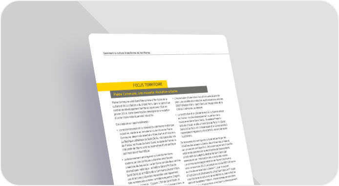 Comment la culture transforme les territoires FOCUS TERRITOIRE Plaine Commune, une nouvelle révolution urbaine Plaine Commune a été identiÕée comme « Territoire de la • L ’implantation d’une industrie audiovisuelle de premier culture et de la création » du Grand Paris, dans le cadre d’un plan. Les sociétés de production audiovisuelle au sein des contrat de développement territorial signé avec l’État en EMGP d’Aubervilliers - Saint-Denis et l’inauguration de la janvier 2014. Cette identiÕcation témoigne de la mutation Cité du Cinéma de Luc Besson. d’un territoire historiquement industriel. • La c onstitution d’un pôle de formation culturelle unique Elle s’appuie sur quatre éléments : en France : le pôle d’enseignement supérieur de la • La reconnaissance de la richesse du patrimoine historique, musique en Seine-Saint-Denis, l’Académie Fratellini industriel, matériel et immatériel du territoire de Plaine (arts du cirque), le pôle universitaire de Paris VIII (Saint- Commune, désormais labellisé « Villes d’art et d’histoire ». Denis) et de Paris XIII (Villetaneuse) et le Conservatoire à La Basilique cathédrale de Saint-Denis, nécropole des rois rayonnement régional du 93 (CRR93), en sont de belles de France, les Puces de Saint-Ouen, le stade de France, la illustrations. cité-jardin de Stains sont les locomotives d’une politique Ce renouveau économique et culturel est porté par les patrimoniale et touristique. initiatives des acteurs culturels, des entreprises privées et • L e foisonnement artistique et culturel du territoire, par un soutien politique fort. Cet accompagnement tripartite soutenu par des politiques culturelles ambitieuses a été rendu possible par la mobilisation de Õnancements créatrices de lien social. Le territoire compte deux centres privés (40 du budget du festival de Saint-Denis par dramatiques nationaux : le théâtre Gérard Philipe de exemple) et par l’implication des collectivités locales. Saint-Denis et le théâtre de la Commune d’Aubervilliers. La communauté d’agglomération de Plaine Commune a Les structures culturelles implantées sont également ainsi consacré en 2013 un budget de plus de 850 000 euros 104 très nombreuses comme : le théâtre équestre Zingaro, au titre de partenariats culturels , pour le soutien l’Académie Fratellini, l’Espace 1789 de Saint-Ouen, le d’institutions et d’évènements s’inscrivant dans le Õl rouge studio théâtre de Stains, l’Embarcadère à Aubervilliers, le « territoire de la culture et de la création », dont le festival Festival de Saint-Denis, Métis, le Panorama des cinémas Métis et l’Académie Fratellini. Plaine Commune considère du Maghreb, le festival international des jonglages, etc. désormais la culture comme un moteur du développement ainsi que de nombreuses associations locales et des urbain, économique et social. artistes implantés. 104 Plaine Commune, Rapport d’Activité 2013 e 94 2 Panorama de l’économie de la culture et de la création en France
