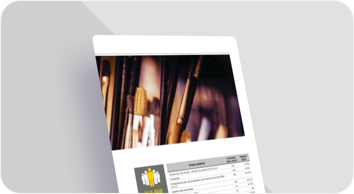 Emplois générés Évolution Emplois 2011-2013 2013 Auteurs des arts visuels*, artisans et ouvriers d'art (2012) +3 73 492 Architectes -0,3 29 831 Professionnels des arts graphiques, de la mode et de la décoration +8 105 633 313 808 (2012) emplois Emplois dans les musées +5 20 129 Emplois des marchands d'arts -1 51 920 Emplois liés à l'impression 3D NA 83 Artisans et ouvriers d’art (2012) -1 22 905 Emplois directs +3,3 303 993 Distribution d'équipements photographiques (2012) +3 7 480 Organisation de foires et expositions d'art +6 484 Évolution emplois Livres beaux-arts et bandes dessinées* + 23 561 2011-2013 Presse arts visuels* -7 823 +3,3% Ventes de matériel de dessin et beaux-arts +3 467 Emplois connexes +3,1 9 815 TOTAL EMPLOIS +3,3% 313 808 * Auteurs des arts visuels (graphistes, peintres, sculpteurs, plasticiens, illustrateurs, dessinateurs, autres - céramique, dessin textile, gravure, vitrail, tapisserie, etc.) Sources : INSEE ; ADAGP ; CPGA ; SYMEV ; SNA ; Chambre des métiers et de l’artisanat ; Maison des artistes ; Ministère de la Culture et de la Communication Création sous tension 23