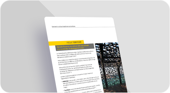 Comment la culture transforme les territoires FOCUS TERRITOIRE Marseille-Provence, une carte de visite internationale et un accélérateur de développement urbain La ville de Marseille a décidé que le label « Capitale européenne de la culture » serait une étape clé de sa stratégie, aÕn de faire partie du « Top 20 » des 113 métropoles européennes avant 2020 . Cette stratégie a pour objectif de relancer le dynamisme économique de la ville, qui doit faire face à un déÕcit de 100 000 emplois privés et à un déÕcit d’image dû à son contexte économique et social. Cette ambition économique s’est traduite, au-delà de l’importance des investissements publics, par une forte participation du secteur privé. Les entreprises mécènes ont contribué à hauteur de 18 au budget total 114 (90 millions d’euros ). Le label « Capitale européenne » a eu quatre principaux impacts sur l’agglomération marseillaise : • Médiatique : avec plus de 11 000 citations, dont 19 à l’étranger en 2013, le label s’est révélé être un véritable vecteur de communication pour le territoire, et a aidé la ville à effectuer un premier pas vers la transformation de son image ; • Touristique : le territoire Marseille-Provence estime avoir accueilli 1,9 million 115 de touristes supplémentaires sur 8 millions de touristes annuels ; • Économique : il y a eu deux types d’impacts : direct, avec 62 millions d’euros d’investissements sur le territoire, sous forme d’achats auprès de fournisseurs ; indirect, avec 500 millions d’euros de retombées économiques grâce aux nouveaux équipements et aménagements116 ; • Urbain : les équipements culturels et les aménagements réalisés par la ville sont appelés à perdurer : le MuCEM (le Musée des civilisations européennes et méditerranéennes) et le musée Regards sur Provence, font désormais partie intégrante de la ville et continueront d’abriter des expositions et d’attirer du public. C’est l’impact touristique qui a été le plus marquant, tant en termes de visibilité internationale que de développement économique et social. La ville de Marseille a ainsi connu une hausse de 8 des nuitées en 2013, avec une hausse marquée de 117 la clientèle étrangère (+21) . Une partie de ces nuitées supplémentaires est due à une hausse du tourisme d’affaires : de multiples entreprises ont choisi Marseille comme destination pour leurs séminaires en 2013. Pôle emploi estime que Marseille-Provence 2013 a créé environ 800 emplois supplémentaires dans le tourisme, les métiers de 113 Mairie de Marseille, « 2013 : Une année capitale pour l’accueil et des transports, dont 21 en CDI, pendant le premier semestre 2013118. Marseille » Portail de la Culture de la Ville de Marseille o 114 CCIMP, Impact MP 2013 n 3, février 2014 115 Entretien avec Maud Favre, Analyste Economique, CCI Marseille-Provence (04-07-2014) 116 Ibid o 117 CCIMP, Impact MP 2013 n 3, février 2014 o 118 CCIMP, Impact MP 2013 n 3, février 2014 - o 2, septembre 2013 Episodes 1 & 2, n e 100 2 Panorama de l’économie de la culture et de la création en France