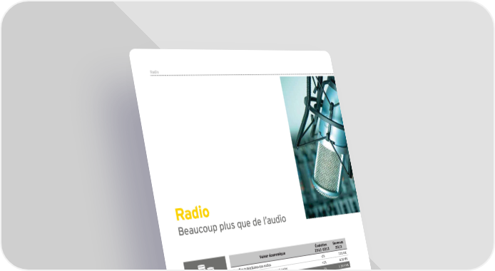 Radio Radio Beaucoup plus que de l’audio Valeur économique Évolution Revenus 2011-2013 2013 Recettes publicitaires des radios -2 736 M€ Contribution à l'audiovisuel public (part radio) +2 618 M€ Revenus directs 0 1 354 M€ 1,6 Mds € Ventes de matériels audio -8 282 M€ Revenus connexes -8 282 M€ TOTAL REVENUS -1,5% 1 636 M€ Évolution revenus 2011-2013 -1,5% Sources : Ministère de la Culture et de la Communication ; CNC ; INSEE ; GfK ; Audiens ; SACD ; SCAM. e e 56 56 2 Panor2ama de l’ Panoraécma de l’onomie de la cultéconomie de la culture et de la crure et de la création en Féation en France rance