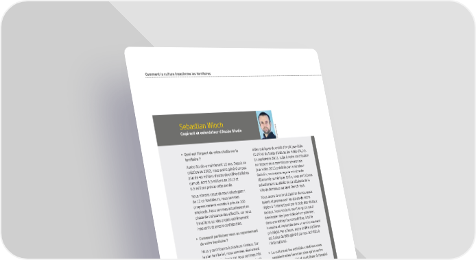 Comment la culture transforme les territoires Sebastian Wloch ne e Cogérant et cofondateur d’Asobo Studio V e © Eloïs • Quel est l’impact de votre studio sur le aides publiques du crédit d’impôt jeu vidéo territoire ? (CIJV) et du fonds d’aide au jeu vidéo (FAJV). Asobo Studio a maintenant 12 ans. Depuis sa En septembre 2013, suite à notre contribution création en 2002, nous avons généré un peu au rapport de la commission sénatoriale plus de 40 millions d’euros de chiffre d’affaires jeux vidéo 2013 présidée par le sénateur cumulé, dont 5,5 millions en 2013 et Gattolin, nous avons reçu la ministre de 6,5 millions prévus cette année. l’Économie numérique. EnÕn, nous participons actuellement au dépôt de candidature de la Nous n’avons cessé de nous développer : ville de Bordeaux au label French Tech. de 12 co-fondateurs, nous sommes Nous avons la volonté d’attirer de nouveaux progressivement montés à près de 100 talents et promouvoir les atouts de notre employés. Nous sommes actuellement en région à l’international par le biais des réseaux phase de croissance des effectifs, car nous sociaux. Nous voulons montrer qu’on peut travaillons sur des projets extrêmement développer des jeux vidéo à fort potentiel, innovants et encore conÕdentiels. dans une entreprise compétitive, à taille • Comment participez-vous au rayonnement humaine et implantée dans un environnement de votre territoire ? privilégié. Par ailleurs, notre chiffre d’affaires Nous y contribuons à plusieurs niveaux. Sur est à plus de 80 généré par nos activités à le plan territorial, nous sommes résolument l’international. implantés à Bordeaux car nous sommes très • La culture et les activités créatives vous sensibles à la qualité de vie de nos employés. semblent-elles favoriser plus qu’un autre Nous avons été distingués localement pour secteur le lien social et contribuer à l’emploi notre dynamisme et notre originalité par le des jeunes sur votre territoire ? Si oui, Prix Objectif Aquitaine (2012) et le Coup de comment ? cœur, Aquitains de l’année BPSO/Sud-Ouest Sans aucun doute, c’est un secteur dynamique (2013). pour les jeunes. Les diplômés d’écoles Nous développons notre potentiel de d’ingénieurs en informatique sont très recrutement en menant des actions de recherchés. La moyenne d’âge du studio relations publiques, car nous avons avant est de 30 ans et 70 de nos stagiaires sont tout cherché à recruter localement. Nous embauchés en Õn d’études. connaissons une forte croissance de nos Nous avons aussi noué de forts partenariats er effectifs (+30 au 1 semestre 2014). avec des écoles de qualité : ENJMIN, Nous sommes également impliqués dans de Supinfogame, ECV, Emile Cohl, ENSEIRB- nombreuses démarches en faveur du jeu vidéo. MATMECA, EPITECH, INSA… Nous avons Nous sommes ainsi membre cofondateur de d’ailleurs édité dernièrement une plaquette Bordeaux Games. En 2012-2013, nous avons de présentation du studio, aÕn de mieux faire siégé à la commission CNC qui attribue les connaître notre Õlière et ses débouchés. e 90 2 Panorama de l’économie de la culture et de la création en France