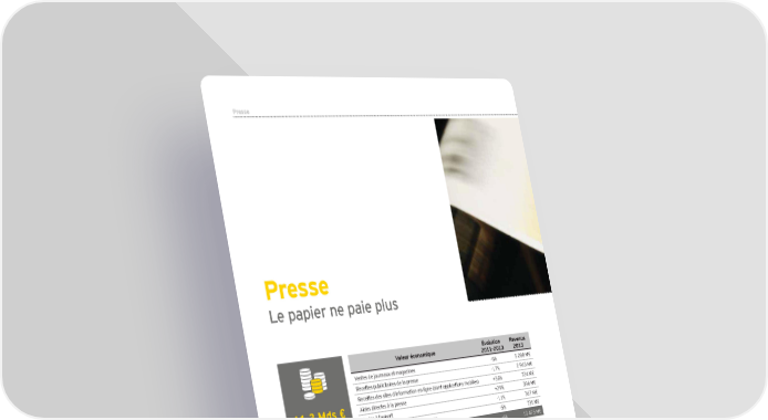 Presse Presse Le papier ne paie plus Valeur économique Évolution Revenus 2011-2013 2013 Ventes de journaux et magazines -5 5 288 M€ Recettes publicitaires de la presse -17 2 965 M€ Recettes des sites d'information en ligne (dont applications mobiles) +36 724 M€ 11,3 Mds € Aides directes à la presse +29 396 M€ Ventes à l'export -11 367 M€ Chiffres d’affaires des agences de presse -5 735 M€ Revenus directs -6 10 475 M€ Ventes de supports numériques de lecture de revues et journaux +33 813 M€ Revenus connexes +33 813 M€ TOTAL REVENUS -3,6% 11 288 M€ Évolution revenus 2011-2013 -3,6% Sources : DGMIC/BREP ; Enquête Presse en ligne ; GfK ; Ministère de la Culture et de la Communication ; Audiens e e 72 72 2 Panor2ama de l’ Panoraécma de l’onomie de la cultéconomie de la culture et de la crure et de la création en Féation en France rance