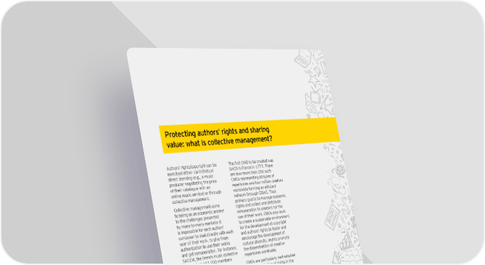 Hrotectin_ aut`orsÌ ri_`ts an\ s`arin_ nadue2 o`at is coddectine eana_eeent7 Au t h ors’ righ t s/ copy righ t can b e L`e firkt ;EG to Ze created oak ex ercised eit h er via individu al S ACD in F rance in 1 7 7 7 . T h ere direct licensing ( e. g. , a mu sic are now more t h an 2 0 0 su ch produ cer negot iat ing t h e price CM O s represent ing all t y pes of of t h eir cat alogu e w it h an repert oires and fou r million creat ors online mu sic service) or t h rou gh oorldoide forein_ an efficient collect ive management . net w ork t h rou gh CIS AC. T h eir Collect ive management came primary goal is t o manage economic t o b eing as an economic answ er righ t s and collect and dist rib u t e t o t h e ch allenges present ed remu nerat ion t o creat ors for t h e b y many - t o- many mark et s: it u se of t h eir w ork . CM O s also w ork is impossib le for each au t h or/ t o creat e a su st ainab le environment composer t o deal direct ly w it h each for t h e development of copy righ t u ser of t h eir w ork , t o give t h em and au t h ors’ righ t s t o fost er and au t h oriz at ion t o u se t h eir w ork s encou rage t h e development of and get remu nerat ion. F or inst ance, cu lt u ral diversit y , and t o promot e S ACE M , t h e F rench mu sic collect ive t h e disseminat ion of creat ive societ y , h as 1 5 3 , 0 0 0 memb ers repert oires w orldw ide. and 5 0 0 , 0 0 0 u sers. It cou ld b e CM O s are part icu larly w ell- adapt ed pract ically impossib le for each of t o t h e negot iat ing of righ t s in t h e t h ese memb ers t o negociat e or digit al era as t h ey provide a one- ent er int o a licence agreement w it h st op- sh op t o get licenses for t h e every pot ent ial licensee. Collect ive D igit al S ou nd P rogrammes ( D S P s) management organiz at ions ( CM O s) for a large nu mb er of w ork s, t h u s are generally ru led b y creat ors fost ering legal secu rit y as w ell as t h emselves, t o b e b ot h t h e int erface simplicit y . F or creat ors and art ist s, b et w een t h em and t h e people u sing t h ey provide plat forms t o manage t h eir w ork s. CM O s are w ork ing nano/ micro pay ment s and pay ment s as cooperat ives, w h ere t h ey can for t h e u se of t h eir w ork s w orldw ide, assemb le t h eir w ork s t o get b et t er and ensu re t h at all repert oires are b argaining pow er w it h u sers ( media t reat ed eq u ally — essent ial t o ensu re ou t let s su ch as T V , radio, int ernet , t h at cu lt u ral diversit y h as t h e means digit al companies, t h eat ers, concert t o b lossom. h alls, et c. ) | Cultural times L`e Õrst _dobad eah o^ cudturad an\ creatine in\ustries *)
