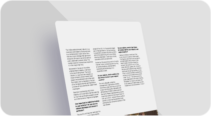 T h e Indian ent ert ainment indu st ry is so ah ead of t h e U S . It is t h e second largest In your op inion, what is the future massively dominat ed b y B olly w ood and, u ser of G oogle S earch . O nline sh opping of emp loyment in your industry and to a lieited eptent$ Komt` Andian filek is ex pect ed t o ex ceed U S $ 1 0 0 b b y 2 0 1 9 region/ country? t h at any mu sic st rat egy t h at ignores or and online advert ising w ill cross U S $ 2 b I b elieve t h at t h e cu rrent siz e of t h e dikcomntk file emkic cannot Ze keriomk ( sou rce: eM ark et er) . It also h as a y ou ng mu sic indu st ry is grossly u ndervalu ed. and is dest ined t o remain nich e. T h e popu lat ion ( 6 3 % are b elow 2 5 ) . L`e fi_mrek hmZlik`ed in variomk rehortk mark et sh are for int ernat ional repert oire F u elled b y t h is ex plosive grow t h of mob ile are rest rict ed t o t h e t u rnover of t h e is in t h e single digit only . int ernet , India is w it nessing t h e ch u rning record lab els; t h ey do not t ak e int o B olly w ood is t h e k ey t o t h e Indian of commu nicat ions, ent ert ainment , accomnt t`e valme of emkic in filek$ ent ert ainment indu st ry . And mu sic mark et ing and t ech nology on a radio, t elevision, games, et c. S ome of is t h e k ey t o B olly w ood. T h e mu sic st u pendou s scale. t h e valu e at t rib u t ed t o t h ese indu st ries — indu st ry is massively dominat ed b y a w h ich are not pay ing roy alt ies, or very single company w h ose mark et sh are In your op inion, what would be the lit t le, t o collect ive righ t s organiz at ions — eq u als t h e comb ined sh are of t h e nex t key future trends in your region/ act u ally sh ou ld act u ally b e accou nt ed fou r lab els. S u ch u nb alance is t h e sign country? u nder “ mu sic. ” T h e sooner w e b ring of an immat u re mark et and t h erefore a F or over a decade, collect ive glob al st andards t o t h e mu sic indu st ry , promise of h igh pot ent ial for det ermined management organiz at ions ( CM O s) t h e fast er t h is indu st ry w ill grow and ch allengers. h ave h ad a st eep learning cu rve t o b e mu sic asset s at t rib u t ed t oday t o ot h er T elevision h as b ecome a € 2 b illion on par w it h t h e q u alit y st andards and indu st ries w ill b e accou nt ed as “ mu sic. ” indu st ry , w it h over 8 5 0 ch annels cat ering efficienciek of ;EGK in ot`er hartk of t o t h e H indi and E nglish speak ers as w ell t h e w orld. R ecent development s give me as t o t h e nu merou s regional langu ages. h ope t h at collect ive licensing w ill st art t o H ow imp ortant is digital technology look u p in 2 0 1 6 . I b elieve t h at an au t h ors in your activity? Do you see any societ y in India h as t h e pot ent ial t o b e among t h e t op 1 0 earners glob ally in t h e related challenges and issues in nex t decade. p articular? T h e cou nt ry w ill b ecome nex t y ear t h e second largest smart ph one mark et , | )(( Cultural times L`e Õrst _dobad eah o^ cudturad an\ creatine in\ustries