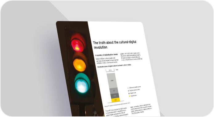 L`e trut` about t`e cudturad%\i_itad renodution 9 narietq o^ \i_itadiration deneds games, w it h U S $ 3 3 .8 b in sales, w ere S ales of digit al cu lt u ral goods and th e w orld’ s b est - selling digit al cont ent , services are est imat ed t o h ave reach ed follow ed b y digit al movies ( U S $ 1 3 b ) , U S $ 6 6 b in 2 0 1 3 . O nline and mob ile mu sic ( U S $ 1 0 .3 b ) and b ook s ( U S $ 8 . 5 b ). W orldwide sales of digital cultural content in 2 0 1 3 ( U S $ b) 6 5 .6 T ot al 3 3 .8 1 3 O nline and mob ile games D igit al movies & video 1 0 .3 D igit al mu sic D igit al b ook s 8 .5 S ou rce: E Y analy sis of cu lt u ral and creat ive mark et s, 2 0 1 5 T h e sh ift from ph y sical t o digit al sales sales. In movies, video- on- demand now is most advanced in recorded mu sic, cont rib u t es more t h an a q u art er of sales w h ere digit al accou nt s for 4 5 % of (2 6 % ) , w h ile in b ook s, e- b ook s comprise pu rch ases w orldw ide, w h ile online and 7 % of t h e glob al mark et . mob ile gaming accou nt for 3 4 % of Digital vs. p hysical content sales in 2 0 1 3 ( % value in U S $ ) T ot al G aming M ovies M u sic B ook s 0 % 2 0 % 4 0 % 6 0 % 8 0 % 1 0 0 % D igit al sales P h y sical sales S ou rce: E Y analy sis of cu lt u ral and creat ive mark et s, 2 0 1 5 | *, Cultural times L`e Õrst _dobad eah o^ cudturad an\ creatine in\ustries