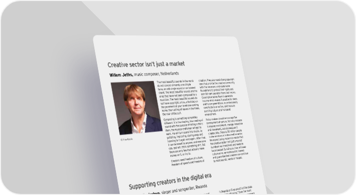 ;reatine sector isnÌt bust a earket W illem J eths, mu sic composer, N et h erlands T h e most b eau t ifu l sou nds in t h e w orld creat ion. T h ey also need st rong copy righ t do not consist of merely one simple law s t h at provide t h e creat ive commu nit y t one, an odd single sou nd or an isolat ed w it h t h e necessary and su st ainab le ch ord. T h e most b eau t ifu l sou nds are t h e fou ndat ions t o prot ect t h eir righ t s and ones t h at h ave not b een composed b y a earn fair remu nerat ion from t h eir w ork s. mu sician. T h e most b eau t ifu l sou nds do Copy righ t enab les t h em t o generat e not h ave copy righ t ; a k iss, a foot st ep on income w h ich mak es it possib le for t h em, t h e pavement of y ou r loved one coming and fu t u re generat ions, t o professionally h ome, t h e ru st ling of leaves in t h e t rees, cont rib u t e t o an act ive, cont inu ou sly t h e roar of t h e su rf. evolving cu lt u re and increased Composing is somet h ing complet ely employ ment . different . It is t h e sh aping, t h e creat ing of P olicy - mak ers sh ou ld encou rage t h e sou nd w it h t h e pu rpose of t elling a st ory : development of cu lt u re. N ot only b ecau se t h en, t h e mu sical craft sman w ill get t o it ensu res enrich ment , ch ange, relax at ion © F riso K eu ris w ork . H e w ill t u rn sou nd int o mu sic, b y and movement , b u t also b ecau se it polish ing, improving, slaving aw ay and creat es j ob s. Close t o 3 0 million people list ening t o it again and again. Aft er t h at , in t h e w orld w ork in t h e creat ive sect or. it can b e h eard b y any one, and every one W e ex pect policy - mak ers t o realiz e t h at can, and w ill, t h ink somet h ing of it . B u t t h e creat ive sect or isn’ t j u st a mark et t h ere are only few t h at act u ally mak e b u t deserves invest ment and needs t o money on it , or t ry t o. b e prot ect ed. B y doing so, t h ey w ill k eep Creat ors need freedom of cu lt u re, cu lt u re alive, serve t h e pu b lic int erest freedom of speech and freedom of and gu arant ee t h at creat ors can cont inu e t o mold sou nds, w ords or images. Kuhhortin_ creators in t`e \i_itad era Cé cile K ayirebwa, singer and songw rit er, R w anda T oday ’ s climat e is fu ll of h ope and in R w anda or if w e are st ill at t h e st age innovat ion. Art ist s are organiz ing of “ w ish fu l- t h ink ing. ” D oes t h e mu sic t h emselves, developers creat e plat forms produ ced in R w anda h ave t h e necessary for online sales/ dist rib u t ion, st reaming level t o compet e in t h e glob al mark et ? and applicat ions, and b ig t elecom D oes t h at “ pop sou nd” favored b y companies are collab orat ing w it h art ist s. y ou ng people b ear a u niq u e and original T h ere is an aw ak ening of R w anda’ s R w andan ident it y ? mu sic scene. T h is involves b u sinesses, R w anda sorely lack s lab els, digit al corporat ions, government agencies, dist rib u t ion net w ork s, people w it h real y ou ng ent repreneu rs, and media, and all k now ledge and ex perience, compet ent of t h is cau ses ex cit ement , a b u z z . W e can creat ors and b u sinesspersons w h o even ob serve a ph y sical manifest at ion on u nderst and t h e real issu es in order t h e net t h rou gh variou s art icles and ads t o cent er all t h is energy in t h e righ t on social media. direct ion. © R oger S angw a T h e q u est ion now is w h et h er t h is is a t ru e digit al revolu t ion t h at is t ak ing place | )(. Cultural times L`e Õrst _dobad eah o^ cudturad an\ creatine in\ustries
