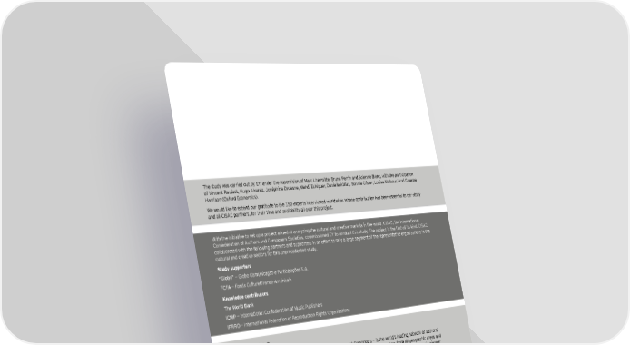 T h e st u dy w as carried ou t b y E Y , u nder t h e su pervision of M arc Lh ermit t e, B ru no P errin and S olenne B lanc, w it h t h e part icipat ion of V incent R au fast , H u go Alvarez , J osé ph ine D ru esne, M eh di E ch igu er, D anielle At t ias, B onnie O livier, Lou isa M elb ou ci and G raeme H arrison ( O x ford E conomics) . W e w ou ld lik e t o ex t end ou r grat it u de t o t h e 1 5 0 ex pert s int erview ed w orldw ide, w h ose cont rib u t ion h as b een essent ial t o ou r st u dy and all CIS AC part ners, for t h eir t ime and availab ilit y all over t h is proj ect . W it h t h e init iat ive t o set u p a proj ect aimed at analy z ing t h e cu lt u ral and creat ive mark et s in t h e w orld, CIS AC, t h e Int ernat ional ;onfederation of 9mt`ork and ;oehokerk Kocietiek$ coeeikkioned =Q to condmct t`ik ktmdy& L`e hrobect ik t`e firkt of itk cind& ;AK9; collab orat ed w it h t h e follow ing part ners and su pport ers in an effort t o rally a large segment of t h e represent at ive organiz at ions in t h e cu lt u ral and creat ive sect ors for t h is u nprecedent ed st u dy . S tudy sup p orters É?doboÊ — Globo Comunicação e Participações S.A. F CF A — Fonds Culturel Franco-Américain K nowledge contributors L`e Oord\ :ank I CM P — Int ernat ional Confederat ion of M u sic P u b lish ers I F R R O — Int ernat ional F ederat ion of R eprodu ct ion R igh t s O rganiz at ions 9bout ;AK9; CIS AC — t h e Int ernat ional Confederat ion of S ociet ies of Au t h ors and Composers — is t h e w orld’ s leading net w ork of au t h ors’ societ ies. W it h 2 3 0 memb er societ ies in 1 2 0 cou nt ries, CIS AC represent s fou r million creat ors from all geograph ic areas and art ist ic repert oires; mu sic, au diovisu al, drama, lit erat u re and visu al art s. CIS AC is presided over b y elect ronic mu sic pioneer J ean- M ich el J arre and t h e organisat ion’ s fou r vice- president s are: B eninese singer Angé liq u e K idj o, S enegalese scu lpt or O u smane Koo$ Andian hoet$ kcrihtoriter and lyricikt Baved 9c`tar and 9r_entinean file director Earcelo HiŽeyro& >omnded in )1*.$ ;AK9; ik a non%_overneental$ not%for%hrofit or_anikation oit` `eadimarterk in >rance and re_ional officek in 9frica :mrcina >ako!$ Datin 9eerica ;`ile!$ 9kia%Hacific ;`ina! and =mrohe @mn_ary!& w w w . cisac. org | T w it t er: @ CIS ACN ew s | F aceb ook : CIS ACW orldw ide. L`anks ;AK9; ooud\ dike to t`ank ^or t`eir hersonad contribution t`e eeebers o^ t`e ;AK9; \e\icate\ oorkin_ _rouh$ as oedd as executines ^roe ;AK9; eeeber societies$ an\ our stu\q suhhorters an\ knoode\_e contributors2 Y oh an B E AU X ( S ACE M ) , Andrew B E R T H O F F ( S O CAN ) , J ames B O Y D ( IF R R O ) , Coco CAR M O N A ( ICM P ) , M it k o CH AT ALB AS H E V ( CIS AC) , Y assine D AM IL ( S ACE M ) , G rah am D AV IE S ( P R S F O R M U S IC) , R ich ard D AV IS O N ( AP R A AM CO S ) , Crist iane D E LE CR O D E ( G LO B O ) , J u liet t e D E LF AU D ( S ACE M ) , H é loï se F O N T AN E L ( S ACE M ) , Lau rence F O U R CH E T ( S O CAN ) , N eil G AF F N E Y ( AS CAP ) , M arisa G AN D E LM AN ( U B C) , D imit er G AN T CH E V ( W IP O ) , Claire G IR AU D IN ( S ACE M ) , J enny G O O D W IN ( P R S F O R M U S IC) , Andrew H AR R IS ( AP R A AM CO S ) , B ronw en H AR T Y ( S AM R O ) , G er H AT T O N ( ICM P ) , Anit a H U S S - E K E R H U LT ( IF R R O ) , Lau re K ALT E N B ACH ( F O R U M D ’ AV IG N O N ) , Clarissa K E D E ( G LO B O ) , E glant ine LAN G E V IN ( F CF A) , O ph ira LU B N IT S K Y ( T ALI) , B laise M IS T LE R ( S ACE M ) , M art in M O LIN U E V O ( T H E W O R LD B AN K ) , S ilvina M U N ICH ( CIS AC) , B enj amin N G ( CIS AC) , E loï se N IK IE M A ( CIS AC) , Alej andra N oramb u ena S k ira ( F CF A) , G adi O R O N ( CIS AC) , B alamine O U AT T AR A ( CIS AC) , Lu is F elipe P ALACIO S ( S G AE ) , F ré dé ric P AT IS S IE R ( IM V Conseil) , Cé cile R O Y ( CIS AC) , D amien S H IE LS ( T H E W O R LD B AN K ) , P et ra S T E P H E N S O N ( P R S F O R M U S IC) , O lav S T O K K M O ( IF R R O ) , S ant iago S CH U S T E R ( CIS AC) , J u lie T O D IS CO ( F CF A) , Liu dmy la T S Y M B AL ( U ACCR ) , and M igu el V O CE S ( S G AE ) .