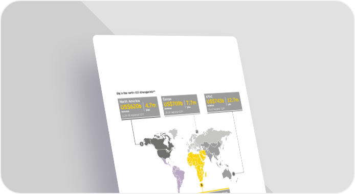 B ig in the north: CCI strongp oints* * N orth A merica E urop e A P A C U S $ 6 2 0 b 4 . 7 m U S $ 7 0 9 b 7 . 7 m U S $ 7 4 3 b 1 2 . 7 m revenue jobs revenue jobs revenue jobs 3 . 3 % of regional G D P 3 % of regional G D P 3 % of regional G D P 2 1 3 5 L atin A merica and the Caribbean 4 A frica and the M iddle E ast U S $ 1 2 4 b 1 . 9 m U S $ 5 8 b 2 . 4 m revenue jobs revenue jobs 2 . 2 % of regional G D P 1 .1 % of regional G D P S ou rce: Cultural times: the first global map of cultural and creative industries, E Y , 2 0 1 5 "" Jomnded fi_mrek | Cultural times L`e Õrst _dobad eah o^ cudturad an\ creatine in\ustries )/