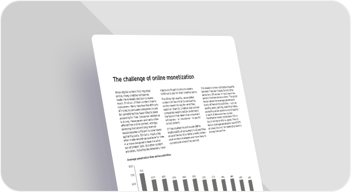 L`e c`adden_e o^ ondine eonetiration O`en di_ital content firkt ei_rated vigorou sly fou gh t t o ensu re view ers T h e research sh ow s not iceab le disparit y online, many creat ive companies cont inu e t o pay for t h eir creat ive w ork s. b et w een free and t ransact ional online made t h e st rat egic decision t o mak e P roviding h igh - q u alit y , valu e- added b eh aviors. O f cou rse, in most cou nt ries, mu ch , if not all, of t h eir cont ent free t o cont ent w ill b e crit ical t o persu ading people lik e free online cont ent . T h e graph conkmeerk& Eany noo face t`e difficmlty online view ers t o pay for w h at t h ey b elow sh ow s t h e average penet rat ion of t ry ing t o persu ade consu mers t o pay w at ch or list en t o. Creat ive and cu lt u ral levels of free online act ivit ies — su ch as for somet h ing t h ey h ave h it h ert o b een companies need t o b et t er u nderst and reading new s, gaming, w at ch ing videos, accessing for free. Consu mer resist ance t h e fact ors t h at det ermine consu mers’ accessing social net w ork s and b logging — is st rong. N ew spapers and radio oft en w illingness — or relu ct ance — t o pay for in each of t h e cou nt ries st u died. offered free online cont ent , w rongly online cont ent . P enet rat ion levels varied from 7 0 % in b elieving t h at advert ising revenu e S ou t h K orea t o 4 3 % in J apan. T h e U S oomld Zecoee kmfficient to cover neok% =Q `ak ktmdied t`e online and ofÖine h ad an average penet rat ion rat e of 5 7 % gat h ering cost s. S imilarly , mu sic sit es media h ab it s of consu mers in 1 2 cou nt ries and w as t h e only non- emerging cou nt ry oft en made recordings availab le for free, arou nd t h e w orld t o b et t er predict w h ere aeon_ t`e toh five& in a move designed t o t ak e t h e w ind paid cont ent st rat egies are more lik ely t o ou t of pirat es’ sails. B u t ot h er cont ent su cceed and w h ere t h ey are not . providers, inclu ding moviemak ers, h ave A verage p enetration free online activities 8 0 % 7 0 % 7 0 % 6 1 % 6 0 % 6 0 % 5 7 % 5 6 % 5 5 % 5 2 % 5 1 % 5 0 % 4 9 % 4 8 % 4 5 % 4 3 % 4 0 % 3 0 % 2 0 % 1 0 % 0 % S ou t h Ch ina India U S B raz il It aly S pain F rance R u ssia G ermany U K J apan K orea S ou rce: Monetizing digital media, E Y , 2 0 1 0 In a recent N ielsen su rvey , 8 5 % of t o pay for cert ain cat egories of cu lt u ral int ernet u sers said t h at online cont ent cont ent , inclu ding movies, games, T V t h at is cu rrent ly free sh ou ld remain free. sh ow s and mu sic, and less lik ely t o pay B u t , u nsu rprisingly , t h e su rvey fou nd for new s, b logs and u ser- creat ed videos. online consu mers may b e more w illing | Cultural times L`e Õrst _dobad eah o^ cudturad an\ creatine in\ustries 0-
