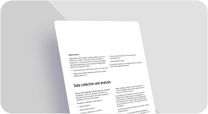 Digital economy D igit al play ers ( online ret ailers, st reaming plat forms, et c. ) are • O nline media advert ising ( for online media and free fu elled b y CCI cont ent . As t h is report aims t o h igh ligh t t h e st reaming services) impact of CCI on ot h er b ranch es of t h e economy , w e assessed • D igit al advert ising creat ion t h e revenu es generat ed b y cu lt u ral cont ent for digit al play ers, defined ak coehaniek hrovidin_2 CCI’ s economic cont rib u t ion t o t h e digit al economy is t h e su m of • P h y sical goods sold on t h e int ernet ( b ook s, mu sic and video) cu lt u ral- cont ent - generat ed revenu es. • D igit al cu lt u ral cont ent ( st reaming su b script ions, mob ile gaming, e- b ook s, et c. ) or earcetk$ t`e kme of re_ional fi_mrek epceeded t`e W h ere regional dat a w as not availab le, w e est imat ed glob al t ot al, as w e logically do not consider ex port s in t h e employ ment and revenu es t h rou gh t ailor- made assu mpt ions: conkolidated fi_mre& • W e scaled u p availab le dat a from t h e main mark et s in each • L`e kme of kectorial fi_mrek eehloyeent and boZk! alko region w it h a represent at ive sample ( for inst ance, B raz il, epceedk t`e conkolidated fi_mre in eac` re_ion$ ak koee M ex ico, Argent ina and Colomb ia for Lat in America) act ivit ies can b e cou nt ed in t w o CCI. F or inst ance, live mu sic • W e u sed w orld dat a and applied a mark et sh are scaling- dow n revenu es and employ ment are cou nt ed in b ot h t h e mu sic and fact or. herforein_ artk kectork& Lo conkolidate omr re_ional fi_mre$ w e dedu ct ed every act ivit y t h at is dou b le cou nt ed. • W h en ab solu t ely no dat a w as availab le for any cou nt ry in a region, w e u sed a rat io b ased on dat a collect ed in ot h er | Cultural times L`e Õrst _dobad eah o^ cudturad an\ creatine in\ustries ))/