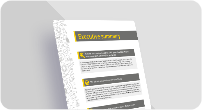 =xecutine sueearq ;udturad an\ creatine in\ustries ;;A! _enerate MK*$*-(b o^ renenues an\ *1&- eiddion bobs oord\oi\e CCI revenu es w orldw ide ex ceed t h ose of t elecom services ( U S $ 1 , 5 7 0 b glob ally ) , and su rpass India’ s G D P ( U S $ 1 , 9 0 0 b ) . W it h in t h e t ot al, t h e t op t h ree earners are t elevision ( U S $ 4 7 7 b ) , visu al art s ( U S $ 3 9 1 b ) , and new spapers and magaz ines ( U S $ 3 5 4 b ) . W it h 2 9 . 5 million j ob s, CCI employ 1 % of t h e w orld’ s act ive popu lat ion. T h e t op t h ree employ ers are visu al art s ( 6 . 7 3 m) , b ook s ( 3 . 6 7 m) and mu sic ( 3 . 9 8 m) . L`e cudturad an\ creatine oord\ is eudtihodar 9kia%Hacific accomntk for MK/,+Z in revenme ++ of _loZal ;;A kalek! and )*&/e boZk ,+ of ;;A boZk w orldw ide) . T h e Asian mark et is driven b y a large popu lat ion, and t h e region is h ome t o CCI leaders, su ch as T encent , CCT V and Y omiu ri S h imb u n. E u rope and N ort h America are t h e second and t h ird largest CCI earcetk& Loday Datin 9eerica$ and 9frica inclmdin_ t`e Eiddle =akt ranc fomrt` and fift`$ rekhectively È b u t CCI play ers see great development opport u nit ies in t h ese t w o regions. T h ou gh sy mb iot ic, each w orld region is developing a moment u m of it s ow n. ;udturad an\ creatine content \rines t`e \i_itad econoeq CCI are a locomot ive of t h e online economy — cont rib u t ing U S $ 2 0 0 b t o glob al digit al sales in 2 0 1 3 . Cu lt u ral and creat ive cont ent also pow ers sales of digit al devices, w h ich t ot aled U S $ 5 3 0 b in 2 0 1 3 . D igit al cu lt u ral goods are, b y far, t h e b iggest revenu e sou rce for t h e digit al economy , generat ing U S $ 6 6 b of B 2 C sales in 2 0 1 3 and U S $ 2 1 . 7 b of advert ising revenu es for online media and free st reaming w eb sit es. ;udturad hro\uction is qoun_$ incdusine an\ entrehreneuriad ;reative activitiek contriZmte ki_nificantly to yomt` eehloyeent and careerk in ;;A are relatively ohen t o people of all ages and b ack grou nds. In E u rope, CCI sect ors t y pically employ ed more people aged 1 5 – 2 9 y ears t h an any ot h er sect or. Creat ive indu st ries also t end t o favor t h e part icipat ion of w omen compared w it h more t radit ional indu st ries. S t at ist ics compiled b y t h e U K G overnment sh ow ed t h at w omen accou nt ed for more t h an 5 0 % of people employ ed in t h e mu sic indu st ry in 2 0 1 4 ( vs. 4 7 % in t h e act ive popu lat ion overall) . M oreover, creat ion is driven b y small b u sinesses or individu als, giving rise t o agile and innovat ive employ ers. M ore t h an h alf ( 5 3 % ) of Canadian gaming developers say t h ey are independent operat ors. In t h e U S , art ist s are 3 . 5 t imes more lik ely t o b e self- employ ed t h an U S w ork ers overall. | 8 Cultural times L`e Õrst _dobad eah o^ cudturad an\ creatine in\ustries