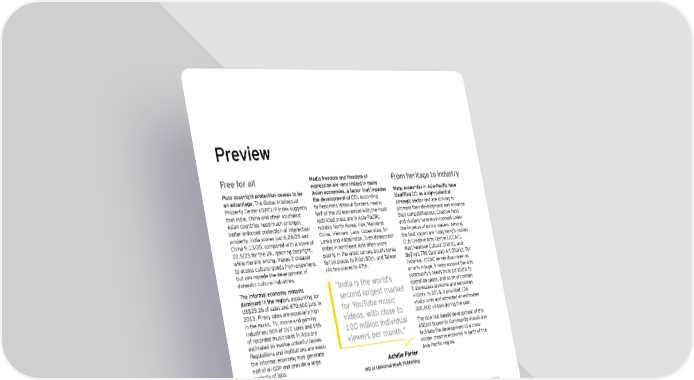Hrenieo >ree ^or add Media freedom and freedom of >roe `erita_e to in\ustrq expression are very limited in many Poor copyright protection ceases to be Asian economies, a factor that impedes Many economies in Asia-Pacific have an advantage. T h e G lob al Int ellect u al the development of CCI. According identified CCI as a high-potential P ropert y Cent er ( G IP C) IP Index su ggest s t o R eport ers W it h ou t B orders, nearly strategic sector and are st riving t o t h at India, Ch ina and ot h er sou t h east h alf of t h e 2 0 economies w it h t h e most promot e t h eir development and enh ance Asian cou nt ries need mu ch st ronger, rektricted hrekk are in 9kia%Hacific$ t h eir compet it iveness. Creat ive h u b s b et t er enforced prot ect ion of int ellect u al not ab ly N ort h K orea, Iran, M ainland and clu st ers h ave mu sh roomed u nder propert y . India scores j u st 6 . 2 4 / 2 5 and Ch ina, V iet nam, Laos, U z b ek ist an, S ri t h e impet u s of policy mak ers. Among Ch ina 9 . 1 3 / 2 5 , compared w it h a score of Lank a and K az ak h st an. E ven democrat ic t h e b est k now n are H ong K ong’ s J ock ey 2 2 . 5 / 2 5 for t h e U K . Ignoring copy righ t , st at es in nort h east Asia oft en score Clu b Creat ive Art s Cent re ( J CCAC) , w h ile morally w rong, mak es it ch eaper poorly . In t h e lat est su rvey , S ou t h K orea W est K ow loon Cu lt u ral D ist rict , and t o access cu lt u ral goods from elsew h ere, fell kip hlacek to finik` -(t`$ and Laioan B eij ing’ s 7 9 8 D aish anz i Art D ist rict . F or b u t can impede t h e development of slid t w o places t o 4 7 t h . inst ance, J CCAC serves du al roles: as domest ic cu lt u ral indu st ries. an art s village, it h elps su pport t h e art s The informal economy remains É An\ia is t`e oord\Ìs commu nit y ’ s needs from art st u dio t o dominant in the region, accou nt ing for secon\ dar_est earket operat ion space, and as an art cent er, U S $ 2 5 . 2 b of sales and 6 7 0 , 6 0 0 j ob s in it sh ow cases art w ork s and w elcomes 2 0 1 3 . P iracy rat es are especially h igh ^or QouLube eusic visit ors. In 2 0 1 4 , it provided 1 3 6 in t h e mu sic, T V , movie and gaming ni\eos$ oit` cdose to st u dio u nit s and at t ract ed an est imat ed indu st ries: 9 0 % of D V D sales and 9 5 % 3 0 0 , 0 0 0 visit ors du ring t h e y ear. of recorded mu sic sales in Asia are )(( eiddion in\ini\uad T h e slow b u t st eady development of t h e est imat ed t o involve u nlaw fu l copies. nieoers her eont`&Ê AS E AN E conomic Commu nit y sh ou ld also R egu lat ions and inst it u t ions are w eak : facilit at e t h e development of a cross- t h e informal economy may generat e b order creat ive economy in part s of t h e h alf of all G D P and provide a large A chille F orler 9kia%Hacific re_ion& maj orit y of j ob s. MD at Universal Music Publishing | +, Cultural times L`e Õrst _dobad eah o^ cudturad an\ creatine in\ustries