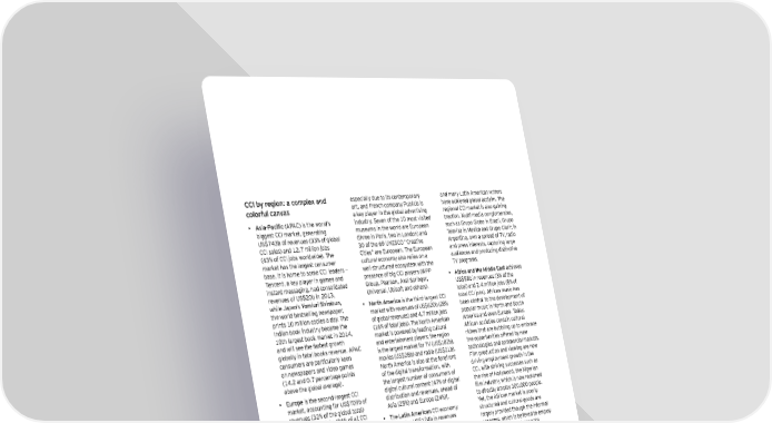 ;;A bq re_ion2 a coehdex an\ especially du e t o it s cont emporary and many Lat in American w rit ers codor^ud cannas art , and F rench company P u b licis is h ave ach ieved glob al acclaim. T h e a k ey play er in t h e glob al advert ising regional CCI mark et is also gaining • Asia-Pacific ( AP AC) is t h e w orld’ s indu st ry . S even of t h e 1 0 most visit ed t ract ion. M u lt i- media conglomerat es, b iggest CCI mark et , generat ing mu seu ms in t h e w orld are E u ropean su ch as G ru po G lob o in B raz il, G ru po U S $ 7 4 3 b of revenu es ( 3 3 % of glob al ( t h ree in P aris, t w o in London) and T elevisa in M ex ico and G ru po Clarin in CCI sales) and 1 2 . 7 million j ob s 3 0 of t h e 6 9 U N E S CO “ Creat ive Argent ina, ow n a spread of T V , radio ( 4 3 % of CCI j ob s w orldw ide) . T h e Cit ies” are E u ropean. T h e E u ropean and press int erest s, capt u ring large mark et h as t h e largest consu mer cu lt u ral economy also relies on a au diences and produ cing dist inct ive b ase. It is h ome t o some CCI leaders — w ell- st ru ct u red ecosy st em w it h t h e T V programs. T encent , a k ey play er in games and presence of b ig CCI play ers ( W P P • Africa and the Middle East ach ieves inst ant messaging, h ad consolidat ed G rou p, P earson, Ax el S pringer, U S $ 5 8 b in revenu es ( 3 % of t h e revenu es of U S $ 2 0 b in 2 0 1 3 , U niversal, U b isoft and ot h ers) . t ot al) and 2 . 4 million j ob s ( 8 % of w h ile J apan’s Qoeiuri K`iebun, • North America is t h e t h ird- largest CCI t ot al CCI j ob s) . African mu sic h as t h e w orld b est selling new spaper, mark et w it h revenu es of U S $ 6 2 0 b ( 2 8 % b een cent ral t o t h e development of print s 1 0 million copies a day . T h e of glob al revenu es) and 4 . 7 million j ob s popu lar mu sic in N ort h and S ou t h Indian b ook indu st ry b ecame t h e ( 1 6 % of t ot al j ob s) . T h e N ort h American America and even E u rope. T oday , 1 0 t h largest b ook mark et in 2 0 1 4 , mark et is pow ered b y leading cu lt u ral African societ ies cont ain cu lt u ral and w ill see t h e fast est grow t h and ent ert ainment play ers: t h e region rich es t h at are b u b b ling u p t o emb race glob ally in t ot al b ook s revenu e. AP AC is t h e largest mark et for T V ( U S $ 1 8 2 b ) , t h e opport u nit ies offered b y new consu mers are part icu larly k een movies ( U S $ 2 8 b ) and radio ( U S $ 2 1 b ) . t ech nologies and commercial mark et s. on new spapers and video games N ort h America is also at t h e forefront F ilm produ ct ion and view ing are now ( 1 4 . 2 and 0 . 7 percent age point s of t h e digit al t ransformat ion, w it h driving employ ment grow t h in t h e ab ove t h e glob al average) . t h e largest nu mb er of consu mers of CCI, w it h st rik ing su ccesses su ch as • Europe is t h e second- largest CCI digit al cu lt u ral cont ent [ 4 7 % of digit al t h e rise of N olly w ood, t h e N igerian mark et , accou nt ing for U S $ 7 0 9 b of dist rib u t ion and revenu es, ah ead of file indmktry$ o`ic` ik noo recconed revenu es ( 3 2 % of t h e glob al t ot al) Asia ( 2 5 % ) and E u rope ( 2 4 % ) ] . t o direct ly employ 3 0 0 , 0 0 0 people. and 7 . 7 million j ob s ( 2 6 % of all CCI • T h e Latin American CCI economy Y et , t h e African mark et is poorly j ob s) . E u rope’ s cu lt u ral economy is generat es U S $ 1 2 4 b in revenu es st ru ct u red and cu lt u ral goods are root ed in it s h ist ory : t h e region enj oy s ( 6 % of CCI glob al mark et ) and largely provided t h ou gh t h e informal a u niq u e concent rat ion of h erit age 1 . 9 million j ob s ( 7 % of t ot al CCI j ob s) . economy , w h ich is b elieved t o employ and art s inst it u t ions. H ow ever, Lat in America and t h e Carib b ean 5 4 7 , 5 0 0 people and generat e E u rope also remains a t rendset t er region possesses a rich cu lt u ral and U S $ 4 . 2 b in revenu es. on t h e glob al st age. F or inst ance, nat u ral h erit age, w it h 1 3 1 sit es t h e U K is a leader in t h e art mark et , inscrib ed on t h e W orld H erit age List , | ). Cultural times L`e Õrst _dobad eah o^ cudturad an\ creatine in\ustries
