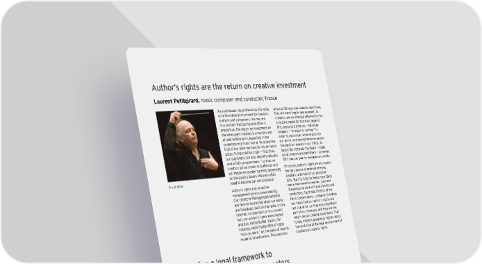 9ut`orÌs ri_`ts are t`e return on creatine innesteent L aurent P etitgirard, mu sic composer and condu ct or, F rance As a composer, my professional life relies ensu res fairness and su st ains repert oires on a favorab le environment for creat ion. t h at are more fragile, less ex posed. As Au t h ors and composers, lik e me, are creat ors, w e are st rongly at t ach ed t o t h is in a posit ion t h at can b e and oft en is collect ive model for t w o main reasons: precariou s: t h e ret u rn on invest ment on firkt$ Zecamke it _ivek mk È individmal t h e t ime spent creat ing is u ncert ain and creat ors — “ st rengt h in nu mb er” in at b est middle t erm, especially in t h e order t o get proper remu nerat ion for cont emporary mu sic w orld. T o collect t h e ou r w ork s; and second b ecau se w e are fru it of ou r lab or w e h ave t o rely on many t h e decision- mak ers in ou r CM O s. At actork in t`e creative c`ain È firkt of all$ S acem for inst ance, t h e B oard — made ou r pu b lish ers, b u t also record produ cers u p of creat ors and pu b lish ers — convenes and art ist ic programmers — so t h at ou r 5 0 t imes per y ear t o manage ou r societ y . creat ion w ill b e sh ow n t o au diences and O f cou rse, au t h or’ s righ t s are not u su ally w ill may b e encou nt er su ccess, depending t h e only sou rce of revenu e of many on t h e pu b lic’ s favors. W e even oft en creat ors, and most of u s h old ot h er © J . B . M illot need t o b ecome ou r ow n produ cer. j ob s. B u t t h is is b y no means new : B ach Au t h or’ s righ t s and collect ive w as a mat h emat ics t each er, Lisz t and management give u s some st ab ilit y . M endelssoh n w ere virt u oso pianist s and O u r collect ive management societ ies condu ct ors, F au ré w as direct or of t h e are h ere t o insu re t h at w h en ou r w ork s P aris Conservat ory … H ow ever, t h is does are b roadcast , b e it on t h e radio, on t h e not mean t h at ou r au t h or’ s righ t s are int ernet , on t elevision or in a concert not crmcial for mk2 t`ey are a ki_nificant h all, ou r au t h or’ s righ t s are collect ed part of ou r revenu es, and t h ey are t h e and du ly redist rib u t ed. S acem, for ret u rn on ou r creat ive invest ment . T h at inst ance, redist rib u t es 8 0 % of righ t s is w h y creat ors are alw ay s vigilant ab ou t “ w ork b y w ork , ” on t h e b asis of report s t h e evolu t ion of t h e legal environment of made b y b roadcast ers. T h is precision int ellect u al propert y righ t s. :uid\in_ a de_ad ^raeeoork to _uarantee ^air reoar\s ^or creators J an S ardi, screenw rit er, Au st ralia Au st ralia’ s cu lt u ral and creat ive indu st ries W it h t h e rapid ex pansion of plat forms in cont rib u t e U S $ 8 6 b annu ally ( 7 % ) t o t h e t h e digit al age, w e are det ermined t o see nat ional economy , and w rit ers simply Au st ralian copy righ t law s b rou gh t int o need t o h ave t h e righ t t o sh are in t h e t h e 2 1 st cent u ry and in h armony w it h ret u rns of t h e int ellect u al propert y t h ey int ernat ional b est pract ice. F u rt h ermore, creat e. Au st ralian w rit ers h ave long b een t h e b u siness models digit al t ech nologies disadvant aged b y a cont ract - b y - cont ract req u ire mean t h at collect ive management t reat ment of copy righ t and secondary of eq u it ab le remu nerat ion for creat ors roy alt ies, one w h ich oft en demands all is t h e only opt ion, t o ensu re t h ey are righ t s assignment s. rew arded for t h e ongoing ex ploit at ion of t h eir w ork . © J an S ardi | Cultural times L`e Õrst _dobad eah o^ cudturad an\ creatine in\ustries )(1
