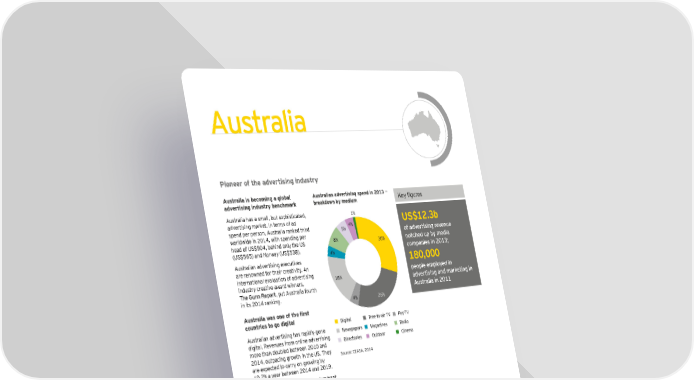 9ustradia P ioneer of the advertising industry A ustralia is becoming a global A ustralian advertising sp end in 2 0 1 3 — Keq Õ_ures advertising industry benchmark breakdown by medium Au st ralia h as a small, b u t soph ist icat ed, 1 % advert ising mark et . In t erms of ad 4 % U S $ 1 2 . 3 b spend per person, Au st ralia rank ed t h ird 5 % o^ a\nertisin_ renenue w orldw ide in 2 0 1 4 , w it h spending per h ead of U S $ 5 0 4 , b eh ind only t h e U S 8 % 3 0 % notc`e\ uh bq ee\ia ( U S $ 5 6 5 ) and N orw ay ( U S $ 5 3 8 ) . 4 % coehanies in *()+3 Au st ralian advert ising ex ecu t ives 1 8 0 , 0 0 0 are renow ned for t h eir creat ivit y . An int ernat ional evalu at ion of advert ising 1 8 % heohde eehdoqe\ in indu st ry creat ive aw ard w inners, a\nertisin_ an\ earketin_ in L`e ?unn Jehort, pu t Au st ralia fou rt h 9ustradia in *()) in it s 2 0 1 4 rank ing. 4 % 2 6 % Amsljalia was gfe g^ l`e fijsl countries to go digital D igit al F ree- t o- air T V P ay - T V Au st ralian advert ising h as rapidly gone N ew spapers M agaz ines R adio digit al. R evenu es from online advert ising D irect ories O u t door Cinema more t h an dou b led b et w een 2 0 1 0 and 2 0 1 4 , ou t pacing grow t h in t h e U S . T h ey S ou rce: CE AS A, 2 0 1 4 are ex pect ed t o carry on grow ing b y 1 0 . 2 % a y ear b et w een 2 0 1 4 and 2 0 1 9 . D igit al advert ising b ecame t h e dominant mediu m in Au st ralia in 2 0 1 3 , secu ring 3 0 % of t h e mark et , compared w it h 2 7 % in t h e U S and 2 5 % on average w orldw ide. T ot al online advert ising w as U S $ 3 . 9 8 b compared w it h U S $ 3 . 8 7 b for advert ising on b roadcast T V . | 3 8 Cultural times L`e Õrst _dobad eah o^ cudturad an\ creatine in\ustries
