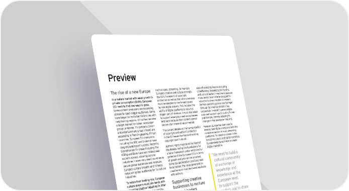 Hrenieo L`e rise o^ a neo =urohe su ch as apps, st reaming. T o maint ain oayk of accekkin_ finance inclmdin_ E u rope’ s creat ive and cu lt u ral st rengt h , crow dfu nding, t arget ed pu b lic fu nding In a mature market with weak growth in t h e E U ’s framew ork of copy righ t and cu lt u ral leaders’ invest ment ) b ecau se private consumption (0.6%), European prot ect ion as w ell as t h at of e- commerce many b ank s h ave h it h ert o st ru ggled t o CCI need to find new ways to grow. mu st b e adapt ed t o t h e t h reat s posed valu e t h e b u siness models of creat ors. S ome cont ent produ cers are ex panding b y new digit al play ers. T h is inclu des t h e G erman pu b lish ing grou p Ax el S pringer ab road t o reach b igger au diences. S ome ab ilit y of digit al plat forms t o secu re a ( t h rou gh it s American division) h as h ave b egu n t o revit aliz e h ist oric t ies w it h b igger part of revenu e. It mu st also adapt su ccessfu lly invest ed in several digit al neigh b oring regions. Africa h as b ecome t o su pport emerging creat ive b u sinesses and creat ive st art - u ps ( inclu ding P ock et a t arget mark et for some: new spaper h eld b ack b ecau se t h eir cont ent cannot and B lendle) , t h ereb y adapt ing t o grou p Le M onde, T V company Canal+ secu re a fair sh are of valu e creat ed. ch anges in t h e new spaper indu st ry . and ent ert ainment grou p V ivendi are T h e cu rrent deb at e on t h e h armoniz at ion H ow ever, E u rope h as b een slow t o ex panding in F rench - speak ing African of copy righ t and au t h ors’ prot ect ion develop new digit al ch ampions ( w it h t h e cou nt ries. E u ropean T V ch ampions in t h e E U leaves t h e fu t u re of ex ist ing not ab le ex cept ion of mu sic st reaming inclu ding t h e B B C and E ndemol h ave copy righ t law s in dou b t . plat forms) . T o remain a pioneer in t h e long enj oy ed ex port su ccess. R ecent ly , disru pt ive cu lt u ral and digit al revolu t ion, S candinavian T V sh ow s inclu ding The Au t h ors’ righ t s mu st b e at t h e h eart of E u rope needs t o learn h ow t o creat e Killing and Bron h ave w on w idespread t h e deb at e, lay ing t h e fou ndat ions for digit al ch ampions. acclaim ab road, allow ing cu lt u ral a fairer framew ork u nder w h ich t h e fu ll indu st ries in even very small cou nt ries t o pot ent ial of t h e E u ropean CCIs in t erms secu re glob al au diences and revenu es. of grow t h and j ob s can b e u nlock ed. É Oe nee\ to buid\ a E u rope’ s cu lt u ral b readt h and rich ness S ome t ax opt imiz at ion pract ices need cudturad coeeunitq h elps w in glob al au diences for it s cu lt u ral t o b e h alt ed. T h e valu e generat ed b y indu st ries. creat ive w ork mu st b e sh ared eq u it ab ly o^ exc`an_e o^ To retain their leading role, European w it h au t h ors. knoode\_e an\ cultural players must join hands with Kuhhortin_ creatine exherience at t`e emerging creative industries in other parts of Europe. E merging gaming businesses to nurture =urohean dened$ indu st ries in Cent ral E u rope ( Croat ia, cudturad dea\ers to suhhort t`e S erb ia and S lovenia) , T V and mu sic in Lmrcey$ and file in Jmkkia offer Europe suffers from a lack of mid-sized creators an\ to s`are opport u nit ies for E u rope t o increase it s companies in its creative sectors. T h e eet`o\odo_ies& Oe add clou t in glob al cu lt u ral indu st ries. smallest companies lack t h e money :uid\in_ a ^airer de_ad t o ex pand. T h e E u ropean Commission ^ace t`e saee hrobdee ektieated in a *()+ ktmdy t`e financin_ o`en oe are _oin_ ennironeent gap for E u ropean CCI b u sinesses at U S $ 8 . 7 b - U S $ 1 4 .5 b and called for abroa\&Ê Competition from newcomers su ch as neo financial inktrmeentk to kmhhort G AF A ( G oogle, Apple, F aceb ook and t h e indu st ry ’ s grow t h and leverage t h e 9earon! and FetÖip `ave hmt `iktoric development of it s small b u sinesses. N ew L ovro N ola revenu e st reams at risk . T h is compet it ion financin_ kc`eeek emkt Ze invented to also enab les innovat ive revenu e models su pport creat ive b u sinesses w it h new Director of Machina Gaming School, Croatia | ,. Cultural times L`e Õrst _dobad eah o^ cudturad an\ creatine in\ustries