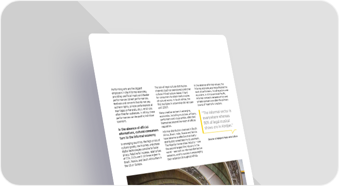 P erforming art s are t h e b iggest T h e lack of legal cu lt u ral dist rib u t ion In t h e ab sence of formal venu es, t h e employ ers in t h e informal economy , ch annels ( su ch as b ook st ores) and ot h er inforeal econoey alko `elhk finance t`e hrovidin_ mnofficial emkic and t`eater cu lt u ral infrast ru ct u re mak es it h ard w ork of performers, inclu ding act ors and performances ( st reet performances, for consu mers t o ob t ain law fu l copies emkiciank& An 9frica and 9kia%Hacific$ fest ivals and concert s t h at do not pay of cu lt u ral w ork s. In S ou t h Africa, t h e informal cont ract s b et w een art ist s and au t h ors righ t s, privat e performances at firkt emltihlep in a toonk`ih did not ohen privat e sponsors are oft en t h e primary marriages or fu nerals, et c. ) , w h ich are u nt il 2 0 0 7 . sou rce of income for creat ors. oft en free for au diences. In Africa, t h ese M any creat ive w ork ers in emerging performances can b e paid b y individu al economies, inclu ding mu sicians, art isans, ÉL`e in^oread sector is sponsors. herforeerk and vikmal artiktk$ often find enerqo`ere o`ereas An t`e absence o^ o^Õciad t`eekelvek Zeyond t`e reac` of official adternatines$ cudturad consueers regu lat ion. 0( o^ de_ad eusicad turn to t`e in^oread econoeq Informal dist rib u t ion ch annels in S ou t h s`oos are in 9bi\ban&Ê Africa, B raz il, India, R u ssia and B olivia In emerging cou nt ries, t h e h igh prices of h ave b ecome so effect ive t h at law fu l cu lt u ral goods, low incomes, and ch eap dist rib u t ors somet imes t ry t o u se t h em. Director of Abidjan’s Palais de la Culture digit al t ech nologies comb ine t o fost er T h e N igerian h ome video indu st ry — now piracy . R elat ive t o incomes, ret ail prices t`e kecond%lar_ekt file indmktry in t`e of CD s, D V D s are 5 - 1 0 t imes h igh er in w orld — w as b u ilt on informal dist rib u t ion B raz il, R u ssia, and S ou t h Africa t h an in net w ork s, and it s su ccess is encou raging t h e U S or E u rope. t h eir ex t ension t h rou gh ou t Africa. | Cultural times L`e Õrst _dobad eah o^ cudturad an\ creatine in\ustries *1