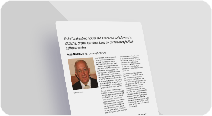 Notoit`stan\in_ sociad an\ econoeic turbudences in Mkraine$ \raea creators keeh on contributin_ to t`eir cudturad sector V asyl N evolov, w rit er, play w righ t , U k raine U k rainian drama au t h ors are cu rrent ly of cu lt ivat ion play s an import ant role facin_ ki_nificant hroZleek& Lom_` in social and economic w ell- b eing of economic environment in U k raine t h e cou nt ry as t h e au t h ors raise spirit s inevit ab ly impact s an ab ilit y of t arget and direct pu b lic mood t o posit ive au dience t o pay forcing t h e t h eat res t o vect or. P rot ect ing t h e condit ions t h at k eep t h e cost of t h e t ick et s for t h eat rical w ill allow u s t o creat e is t h e k ey t o performances at minu scu le level. F or su st ainab le economic, social and cu lt u ral t h is very reason, U k rainian t h eat res are development . not aZle to increake Zop%office receihtk N ot w it h st anding social and economic depriving righ t h olders of dramat ic righ t s t u rb u lence in U k raine, drama creat ors of t h eir fair remu nerat ion. T h e sit u at ion k eep on developing and cont rib u t ing ik oorkened Zy inkmfficient ktate fmndin_ t o t h eir cu lt u ral sect or. I see more and of t h e cu lt u ral sect or. As a resu lt , most more U k rainian play w righ t s and direct ors of t h e st at e t h eat res oft en do not h ave mak ing int ernat ional career as nat ional fu nds t o mak e t imely roy alt y pay ment s. b ou ndaries erase. T h e informat ion Credit : V asy l N evolov T h e main prob lem also remains w eak is b eing spread inst ant ly , allow ing le_iklative fraeeoorc leadin_ to financial U k rainian creat ors t o b e u p t o dat e on inst ab ilit y of t h e creat ors. U nau t h oriz ed t h e w orld’ s lat est t rends in drama sect or u se of ou r w ork s b y t h eat res, int ernet and promot e U k rainian cu lt u re ab road. piracy and ot h er IP issu es sh all b e W e are also very h appy t o see grow ing u rgent ly addressed b y t h e government . nu mb er of int ernat ional t h eat rical W h en t h e st at e ignores t h e creat ive fest ivals t ak ing place in U k raine as w ell as indu st ry , it resu lt s in fru st rat ion and increasing nu mb er of w ork s of U k rainian vu lnerab ilit y of t h e au t h ors w h ich is drama au t h ors st aged at t h e t h eat res all det riment al t o creat ivit y . At t h e same over t h e w orld. t ime, I st rongly b elieve t h at overall level