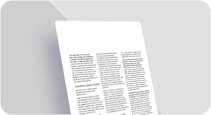 The combination of rising leisure ex port s h ave h elped sh ift percept ions Y ork , London and P aris. H u ge pu b lic and time, communication and education is of K orea: a su rvey b y t h e K orea hrivate invekteent `ak Öooed into t`e enhancing international awareness of Int ernat ional T rade Associat ion fou nd creat ive and cu lt u ral sect or as a resu lt . the region’s creative potential. M aj or t h at 8 0 % of respondent s from J apan, Chinese collectors have become hugely cu lt u ral event s h ave h elped h igh ligh t M ainland Ch ina, T aiw an and V iet nam influential in global visual arts markets progress, not ab ly u niversal ex posit ions at b elieved t h at H ally u h ad posit ively and Chinese investors are rapidly Aich i ( J apan) in 2 0 0 5 , S h angh ai ( Ch ina) inÖmenced t`e hmrc`ake of Komt` Corean expanding into cinema, gaming and in 2 0 1 0 and Y eosu ( S ou t h K orea) in produ ct s. In 2 0 1 1 , S ou t h K orean cu lt u ral TV. Ch inese collect ors h ave b ecome 2 0 1 2 . T h e region is also h ome t o some ephortk$ inclmdin_ filek$ emkic and LN hrolific Zmyerk in _loZal fine art earcetk$ of t h e w orld’ s b est - k now n t radit ional sh ow s, h it a record U S $ 4 . 2 b . S ou t h acq u iring b ot h Ch inese and W est ern art fest ivals: Ch erry B lossom ( J apan) , K orea is now a role model for Asian for display in privat e collect ions or in t h e S ongk ran ( T h ailand) , D iw ali ( India) and cou nt ries t h at are seek ing t o redu ce cou nt ry ’ s rapidly - ex panding net w ork of t h e Lant ern F est ival ( Ch ina) . t h eir reliance on import ed ent ert ainment mu seu ms and galleries. F ine art sales and provide j ob s for art ist s, w rit ers, of U S $ 1 2 . 5 b in 2 0 1 3 made Ch ina t h e =xhortin_ cudturad eo\eds produ cers, set and cost u me designers, w orld’ s second- largest mark et , aft er t h e and ot`erk involved in file and televikion U S . M u seu ms are also an int egral part N ew Asian cu lt u ral indu st ry models produ ct ion. of t h e cou nt ry ’ s cu lt u ral renaissance are b eginning t o emerge, aiding AndiaÌk file indmktry ik noo t`e oorldÌk st rat egy : t h eir nu mb er dou b led t o 4 , 0 0 0 regional ex port s. largest in t erms of annu al produ ct ion in t h e decade t o 2 0 1 3 . J apan is st riving t o b ecome a cu lt u ral nu mb ers, t u rning ou t 3 , 0 0 0 movies As audiences increase rapidly, China has su perpow er, b u t more t h an a decade a y ear in more t h an 2 0 langu ages. also begun to stamp its authority on the aft er it s incept ion, t h e G overnment ’s O nce cent ered largely u pon mu sical film industry. T h e rapid opening of new ;ood Bahan campaign remains lack lu st er. filek$ koee Andian eoviek increakin_ly cinemas h as led t o soaring au diences. H ow ever, J apanese anime, video games resemb le int ernat ional offerings, and ;`ineke Zop office receihtk noo ranck and manga comics, w h ich appeal t o many t h ank s t o t h e cou nt ry ’ s large diaspora, second w orldw ide ( b eh ind t h e U nit ed u rb an and y ou ng people in b ot h Asia and gain a nich e ent ry t o non- Indian S t at es) . M ainland Ch ina’ s movie indu st ry t h e W est , are st ill t h riving. commu nit ies arou nd t h e w orld, especially is t h riving; aided b y t h e int ernat ional S ou t h K orean cu lt u re h as gradu ally in t h e M iddle E ast and S ou t h Asia. repu t at ion and sk ills of H ong K ong movie gained int ernat ional mark et s, especially ;udturad re%coniuest mak ers, it ach ieved y ear- on- y ear grow t h among t h e y ou t h , since t h e 1 9 9 0 s. T h e of 2 7 % and 3 6 % in t h e past t w o y ears. K orean W ave, also k now n as H ally u , In 2009, a meeting of China’s State D omest ic and collab orat ive int ernat ional reach ed Ch ina via K - pop and T V soaps. It Council declared culture a strategic produ ct ions are gaining art - h ou se also reach ed a b roader y ou t h au dience industry that should generate at amdiencek$ o`ile hohmlar filek$ kmc` via social media plat forms inclu ding least 5% of the country’s GDP. Ch ina’s as t h e D et ect ive D ee series, now w in F aceb ook and Y ou T u b e, w h ere it capt u red “ cu lt u ral st rat egy ” aims b ot h t o sat isfy sh ow ings w orldw ide. t h e at t ent ion of t ech - savvy and cu lt u rally a grow ing domest ic demand for cu lt u re, cu riou s au diences in N ort h America as w ell as enh ance Ch ina’ s h eft arou nd and W est ern E u rope. In 2 0 1 1 , K - pop t h e w orld and b et t er enab le Ch inese w as a glob al ph enomenon, w it h nearly cit ies t o compet e w it h rivals, su ch as N ew 2 . 3 b illion Y ou T u b e view s. Cu lt u ral | Cultural times L`e Õrst _dobad eah o^ cudturad an\ creatine in\ustries +-