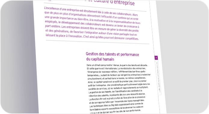 1Collaborateurs et culture d’entreprise L’excellence d’une entreprise est étroitement liée à celle de ses collaborateurs. Alors que de plus en plus d’organisations démontrent l’efficacité d’un système qui accorde une grande importance au bien-être, à la motivation et à la responsabilisation de leurs employés, le développement des collaborateurs est devenu un levier de croissance à part entière. Les entreprises doivent être en mesure de gérer la diversité des profils et des générations, de favoriser l’intégration autour d’une vision partagée tout en laissant la place à l’innovation. C’est ainsi qu’elles pourront demeurer compétitives. Gestion des talents et performance du capital humain 7 7 7 S u r q Dans un climat concurrentiel intense, la guerre des talents est déclarée. u e l Et cette guerre est internationale. La mondialisation des entreprises, s l e v i l’émergence de nouveaux métiers, l’effritement des barrières spatio- e r temporelles… : autant de facteurs qui obligent les entreprises à rechercher s d e t r simultanément, et partout dans le monde, les mêmes compétences. a n s f Ainsi, le capital humain est un actif de premier plan, sinon le premier o r m actif de l’entreprise. Une problématique particulièrement aigüe dans nos a t i o sociétés de services, où les rachats et rapprochements se multiplient. n a g i La gestion de ces talents, de l’identification des candidats à la r rétention des salariés, représente dès lors une nécessité absolue. ? La fonction RH est le pivot à la fois de l’évolution de ce processus et de son appropriation par l’ensemble des lignes managériales. Les techniques liées au Big data apparaissent ainsi comme de formidables apports susceptibles de bouleverser les codes en vigueur et de donner aux RH les clés de leur performance.