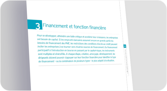 3Financement et fonction financière Pour se développer, atteindre une taille critique et accélérer leur croissance, les entreprises ont besoin de capital. Si les emprunts bancaires assurent encore en grande partie les besoins de financement des PME, les restrictions des conditions d’accès au crédit peuvent inciter les entreprises à se tourner vers d’autres sources de financement. Du financement 252525 S u participatif à l’introduction en bourse en passant par le capital-risque, les instruments r q u e l sont multiples et diversifiés. A chaque étape, création, amorçage, développement, les s l e v i dirigeants doivent pouvoir s’appuyer sur leur fonction financière pour identifier le type e r s d de financement – ou la combinaison de plusieurs types – le plus adapté à la situation. e t r a n s f o r m a t i o n a g i r ?