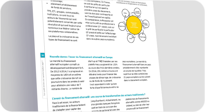 • microcrédit ; pourtant pas les mêmes dans tous Dans les nouveaux modes de financement, • don sans contrepartie ; les pays européens. En France, investisseurs et récipiendaires se confondent. • affacturage ; ce sont les prêts de particulier • placement privé/placement à particulier qui occupent la Investis- de fonds de pensions. première place du classement, Prêts sements TPE, ETI, groupes, communautés, suivi du don avec contrepartie et institutions, ce sont tous les de l’investissement en capital. acteurs de l’économie qui sont En comparaison, le Royaume-Uni Particuliers Micro- mise sur le prêt de professionnel à TPE/ETI crédits potentiellement concernés par cette Placements Groupes ère Communautés révolution et qui sont toujours plus professionnel (1 place), puis sur nombreux à se fédérer autour de le prêt de particulier à particulier e ces plateformes collaboratives. (2 place) et enfin sur l’affacturage e Affacturage La place et la croissance de ces (3 place, marché encore inexistant Dons types de financement ne sont dans les autres pays européens). 3030 Nouvelle donne : l’essor du financement alternatif en Europe ?? Le marché du financement start-up et PME financées par ces pays européens. Le marché du rr ii gg alternatif européen connaît un plateformes a augmenté de 133 % financement alternatif dans les pays n an a oo ii développement extrêmement fort. au cours des trois dernières années. précédemment cités représente tt aa mm De 2012 à 2014, il a progressé en En 2014, 201 millions d’euros ont un volume de liquidités 7 fois rr oo ff ss moyenne de 145 % et on estime été ainsi levés pour financer des supérieur au total combiné des nn aa rr que cette croissance devrait se phases de démarrage, de croissance 21 pays européens qui les suivent e te t s ds d poursuivre dans les années à venir ou de fonds de roulement. dans le classement européen. rr ee ii vv pour atteindre une valeur de 7 Il est cependant à noter qu’une ee s ls l ll ee milliards d’euros. Le nombre de forte disparité demeure entre les uu r qr q uu SS L’avenir du financement alternatif : une source de transformation des acteurs traditionnels ? Face à cet essor, les acteurs jusqu’à présent. Actuellement, les plateformes de financements traditionnels de la finance tentent plus grandes banques françaises alternatifs comme WiSEED ou de s’adapter pour capter des sont en train de conclure des Unilend, ou bien de créer leur marchés qui leur échappaient accords de partenariat avec des propre outil de financement