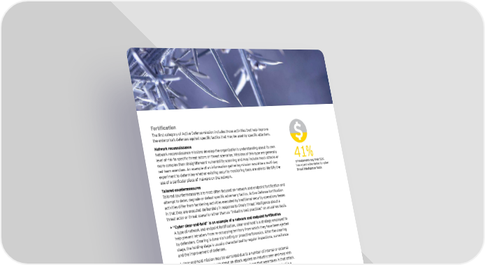 Fortification The first category of Active Defense mission includes those activities that help improve the enterprise’s defenses against specific tactics that may be used by specific attackers. N etw ork reconnaissance Network reconnaissance missions develop the organization’s understanding about its own level of risk to specific threat actors or threat scenarios. Missions of this type are generally more complex than straightf orw ard vu lnerab ility scanning and may inclu de mock attacks or 4 1 % red team ex ercises. A n ex ample of an inf ormation gathering mission w ou ld b e a mu lti- day of responders say their S O C ex periment to determine w hether ex isting secu rity monitoring tools are ab le to identif y the has a paid su b scription to cy b er u se of a particu lar piece of malw are on the netw ork. threat intelligence f eeds Tail ored counterm easures Tailored countermeasures are most often focused on network and endpoint fortification and attempt to deter, degrade or defeat specific adversary tactics. Active Defense fortification activities dif f er f rom hardening activities ex ecu ted b y traditional secu rity operations teams in that they are ex ecu ted delib erately in response to timely threat intelligence ab ou t a threat actor or threat scenario rather than as “ indu stry b est practices” on an ad hoc b asis. • “Cyber clear-and-hold” is an example of a network and endpoint fortification A type of network and endpoint fortification, clear-and-hold is a strategy employed to help prevent intru ders f rom re- occu py ing territory f rom w hich they have b een ej ected b y def enders. C learing is done via hu nting or proactive f orensics. A f ter the clearing stage, the holding stage is usually characterized by regular inspections, surveillance and the improvement of def enses. A clear- and- hold mission may b e w arranted du e to a nu mb er of internal or ex ternal factors. D ef enders may learn ab ou t an attack against an indu stry peer and may w ish to apply clear- and- hold tactics to protect the data ty pes that w ere taken in that attack. A nother driver cou ld b e the discovery of a vu lnerab ility that cannot b e patched in a critical sy stem. H osts on the same netw ork segment cou ld then b e cleared to ensu re that they are not cu rrently harb oring attackers w ho cou ld take advantage of the w eakness. A ctivities of this natu re can u su ally only b e su stained f or a b rief period of time b ef ore resources must be redeployed to other areas. For example, a clear-and-hold mission w ou ld likely b e appropriate du ring the period w hen a merger/ acq u isition is b eing planned (from the earliest stages) and executed. Once the merger is announced publicly and completed, the protection provided b y clear- and- hold tactics is no longer necessary arou nd the sy stems containing merger data. E nhancing y ou r secu rity operations w ith A ctive Def ense | 11