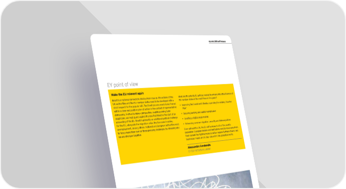 ey.com/attractiveness EY point of view Make the EU relevant again Brexit is a national democratic choice. From now on, the actions of the What are the priority EU policies needed to enhance the attractiveness of UK authorities and the EU member states need to be developed with a EU member states in the next three to five years? strict respect for the popular will. The Brexit process needs to be framed • Improving the investment climate, expanding the existing “Juncker within a clear and positive plan of action in the context of representative Plan” democracy. From a European perspective, despite growing Euro- skepticism, we must guard against the idea that Brexit is the start of an • Securing banking and capital market union unraveling of the EU. Brexit is primarily an additional political challenge • Creating a digital single market for the EU, alongside the migration crisis, the Eurozone troubles, unemployment, among others. National and European authorities need • Enhancing common migration, security and defense policies to focus more than ever on these pressing challenges, by stressing why Even without the UK, the EU will be home to 6% of the world’s we are stronger together. population. European leaders and institutions need to move away from their current fire-fighting mode to better respond to their citizens’ and businesses’ needs and to stay relevant in this globalized world. Alessandro Cenderello EY EU Institutions Leader EY’s European attractiveness survey January 2017 9