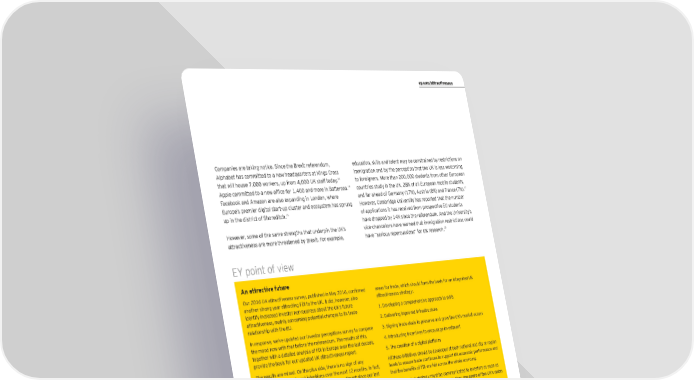 ey.com/attractiveness Companies are taking notice. Since the Brexit referendum, education, skills and talent may be constrained by restrictions on Alphabet has committed to a new headquarters at Kings Cross immigration and by the perception that the UK is less welcoming 14 to foreigners. More than 200,000 students from other European that will house 7,000 workers, up from 4,000 UK staff today. 15 countries study in the UK, 28% of all European mobile students, Apple committed to a new office for 1,400 and more in Battersea. Facebook and Amazon are also expanding in London, where and far ahead of Germany (17%), Austria (8%) and France (7%).17 Europe’s premier digital start-up cluster and ecosystem has sprung However, Cambridge University has reported that the number 16 up in the district of Shoreditch. of applications it has received from prospective EU students have dropped by 14% since the referendum. And the University’s However, some of the same strengths that underpin the UK’s vice-chancellors have warned that immigration restrictions could 18 attractiveness are more threatened by Brexit. For example, have “serious repercussions” for UK research. EY point of view An attractive future Our 2016 UK attractiveness survey, published in May 2016, confirmed areas for trade, which should form the basis for an integrated UK another strong year attracting FDI to the UK. It did, however, also attractiveness strategy: identify increased investor nervousness about the UK’s future 1. Developing a comprehensive approach to skills attractiveness, mainly concerning potential changes to its trade relationship with the EU. 2. Delivering improved infrastructure In response, we’ve updated our investor perceptions survey to compare 3. Signing trade deals to preserve and grow the UK’s market access the mood now with that before the referendum. The results of this, 4. Introducing incentives to encourage investment together with a detailed analysis of FDI in Europe over the last decade, provide the basis for our updated UK attractiveness report. 5. The creation of a digital platform The results are mixed. On the plus side, there is no sign of any All these initiatives should be developed at both national and city or region deterioration in investment intentions over the next 12 months. In fact, levels to ensure trade continues to support UK economic performance and there has been an improvement in short-term sentiment since our last that the benefits of FDI are felt across the whole economy. survey. This integrated strategy must be communicated to investors as soon as However, the medium-term outlook has worsened across a number of possible, with a focus on making certain they are aware of the UK’s vision metrics and investors are concerned about how the UK’s attractiveness for the economy beyond 2019. will develop over the next three years. The respite offered by the stable The current environment is challenging, but there are opportunities as immediate outlook offers the UK Government the chance to implement well as threats. The UK has the chance to move decisively and to position policies that will maintain and grow the UK’s longer-term attractiveness. itself for an attractive future. A sector strategy is essential for shaping the UK’s approach to FDI, and to trade more generally. Once sector priorities have been identified, Mark Gregory our discussions with investors indicate that there are five priority action Chief Economist, EY UK & Ireland 14 “Google commits to £1bn UK investment plan,” BBC website, http://www.bbc.com/news/ business-37988095, accessed 20 December 2016. 15 “Apple moves UK HQ to Battersea power station boiler room in London,” The Guardian website, 17 “EUA Brexit Factsheet: UK — European Research Collaboration and Student Mobility,” European https://www.theguardian.com/uk-news/2016/sep/28/apple-moves-british-hq-into-battersea-power- University Association website, http://www.eua.be/Libraries/publications-homepage-list/ station-boiler-room, accessed 19 December 2016. eua-brexit-factsheet-research-collaboration-and-student-mobility, accessed 8 December 2016. 16 “Facebook ‘likes’ Britain’s talent, to add jobs despite Brexit,” Reuters website, http://www.reuters. 18 “Cambridge warns of Brexit hit on EU student numbers,” Financial Times website, https:// www. com/article/us-facebook-britain-idUSKBN13G0VV, accessed 19 December 2016. ft.com/content/f4b1cd0a-bd68-11e6-8b45-b8b81dd5d080, accessed 19 December 2016. EY’s European attractiveness survey January 2017 15