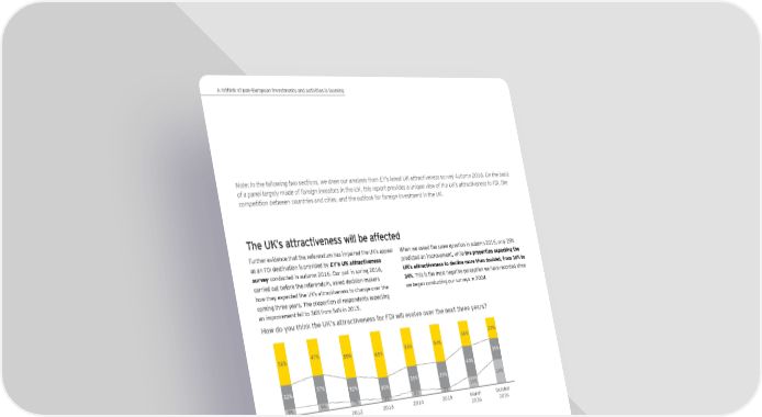 A rethink of pan-European investments and activities is looming Note: In the following two sections, we draw our analysis from EY’s latest UK attractiveness survey Autumn 2016. On the basis of a panel largely made of foreign investors in the UK, this report provides a unique view of the UK’s attractiveness to FDI, the competition between countries and cities, and the outlook for foreign investment in the UK. The UK’s attractiveness will be affected Further evidence that the referendum has impaired the UK’s appeal When we asked the same question in autumn 2016, only 29% as an FDI destination is provided by EY’s UK attractiveness predicted an improvement, while the proportion expecting the survey conducted in autumn 2016. Our poll in spring 2016, UK’s attractiveness to decline more than doubled, from 16% to carried out before the referendum, asked decision-makers 34%. This is the most negative perception we have recorded since how they expected the UK’s attractiveness to change over the we began conducting our surveys in 2004. coming three years. The proportion of respondents expecting an improvement fell to 36% from 54% in 2015. How do you think the UK’s attractiveness for FDI will evolve over the next three years? 36% 29% 56% 47% 59% 65% 54% 54% 30% 44% 32% 37% 32% 35% 39% 30% 34% 9% 9% 7% 4% 8% 5% 16% 2010 2011 2012 2013 2014 2015 March October 2016 2016 Improve Stay the same Decrease Source: EY’s UK attractiveness survey 2012–2016. European investors are the most pessimistic on the UK’s • Flexible labor markets and a large, diverse, creative skills investment attractiveness outlook. Overall, 43% expect a decline pool, with low payroll taxes helping the UK present itself as a and only 23% an improvement. competitive location • Outstanding science, research and technology capacity, although Minimizing any damage to the UK’s growth potential will require Brexit partly puts this at risk since one in four UK academic special care. The complex links between the UK and the EU, 12 research publications arise from a European partnership which have matured over 40 years, may complicate efforts by UK • Tax competitiveness, with the promise of a corporate income tax policymakers to change course. Post Brexit, we believe the UK will 13 (CIT) cut from 20% now to 17% pursue a vigorous blend of free trade policies backed by targeted • London, one of the world’s truly global cities with a interventions. unique combination of language, low taxes, lifestyle, tech skills — although many of these are imported — and tech-savvy The UK’s attractiveness will be underpinned by long-standing consumers, which appeals strongly to Californian technology strengths: companies • Good governance, light regulation, strong financial markets and business support ecosystems 12 “EUA Brexit Factsheet: UK — European Research Collaboration and Student Mobility,” European 13 “Brexit: George Osborne pledges to cut corporation tax,” BBC website, http://www.bbc.com/news/ University Association website, http://www.eua.be/Libraries/publications-homepage-list/ business-36699642, accessed 20 December 2016. eua-brexit-factsheet-research-collaboration-and-student-mobility, accessed 8 December 2016. www.ft.com/content/f4b1cd0a-bd68-11e6-8b45-b8b81dd5d080, accessed 19 December 2016. 14 EY’s European attractiveness survey January 2017