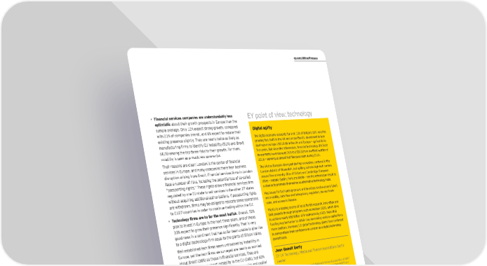 ey.com/attractiveness • Financial services companies are understandably less EY point of view: technology optimistic about their growth prospects in Europe than the sample average. Only 12% expect strong growth, compared Digital agility with 21% of companies overall, and 6% expect to reduce their existing presence slightly. They are nearly twice as likely as The digital economy accounts for over 10% of Britain’s GDP. And it is manufacturing firms to identify EU instability (51%) and Brexit growing fast, both in the UK and across the EU. Investment in tech (41%) among the top three risks to their growth. For them, start-ups now tops US$13.6b in the UK and Europe — up fivefold in volatility is seen as a much less severe risk. five years. But since the referendum, financial technology (FinTech) investments have slumped 26% to US$532m in the third quarter of Their reasons are clear: London is the center of financial 2016 — running at almost half the pace seen during 2015. services in Europe, and many companies there fear business The UK has Europe’s strongest start-up ecosystem, centered in the disruption arising from Brexit. Financial services firms in London London district of Shoreditch, but spilling out into high-tech centers face a number of risks, including the potential loss of so-called around the university cities of Oxford and Cambridge. European “passporting rights.” These rights allow a financial services firm cities — notably Dublin, Paris and Berlin — see the referendum result as regulated by one EU state to sell services in the other 27 states a chance to promote themselves as alternative technology hubs. without acquiring additional authorizations. If passporting rights Key issues for tech entrepreneurs and investors revolve around talent are withdrawn, firms may be obliged to relocate some operations and mobility, data flow and data privacy regulation, tax and trade to EU27 countries in order to continue trading within the EU. rules, and access to finance. • Technology firms are by far the most bullish. Overall, 72% The EU is a leading source of funds for UK research, innovation and plan to invest in Europe in the next three years, and of these, SME projects through programs such as Horizon 2020, which aims 33% expect to grow their presence significantly. That is very to achieve nearly €80 billion of investments by 2020. Fears that good news in a continent that has so far been unable to give rise funding may be harder to obtain may be making venture capital firms to a digital technology firm equal to the giants of Silicon Valley. more cautious. However, US global technology giants have continued to demonstrate their confidence in London as a digital technology Well-established tech firms seem untroubled by instability in powerhouse. Europe, yet the tech firms we surveyed are nearly as worried about Brexit (38%) as those in financial services. They are Jean-Benoit Berty much less bothered about instability in the EU (24%), but 60% EY UK Technology, Media and Telecommunications Sector are alarmed at volatility in commodities, currencies and capital Leader markets. One explanation may be that young tech firms rely heavily upon external funding, and fear that their financing Source: “UK’s digital economy is world leading in terms of proportion of GDP,” ecosystem could be upset by Brexit. TechUK.org website, https://www.techuk.org/insights/news/item/4075-uk-s- digital-economy-is-world-leading-in-terms-of-proportion-of-gdp, accessed 12 Despite its poor performance in building consumer-oriented December 2016; “Action is needed now to stem the flow of vital technology talent,” The Times website, http://www.thetimes.co.uk/article/action-is- digital champions, Europe is widely seen as a powerhouse needed-now-to-stem-the-flow-of-vital-technology-talent-8dnqbqt5k, accessed in emerging technologies such as artificial intelligence, the 9 December 2016. “Brexit depression casts dark cloud over UK fintech investment,” Finextra website, https://www.finextra.com/newsarticle/29772/ internet of things and robotics. The continent, on both sides brexit-depression-casts-dark-cloud-over-uk-fintech-investment, accessed 9 of the English Channel, has produced many promising young December 2016; “European Social Fund 2014–2020,” European Commission website, http://ec.europa.eu/esf/main.jsp?catId=62, accessed 9 December 2016. companies in these fields, and hosts powerful ecosystems underpinned by close links between industry and academia. • Mid-sized companies will continue to seek growth in Europe. More than two-thirds expect to grow their presence in Europe, and 26% plan significant expansion. For them, it is volatility in currency and commodity markets that poses the biggest business risk, with the slowdown in trade flows, and Brexit in second and third places. EY’s European attractiveness survey January 2017 11