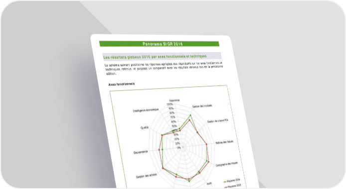 Panorama SIGR 2016 Les résultats globaux 2016 par axes fonctionnels et techniques Le schéma suivant positionne les réponses agrégées des répondants sur les axes fonctionnels et techniques retenus, et propose un comparatif avec les résultats obtenus lors de la précédente édition. Axes fonctionnels Notons que : La forme générale de la courbe de couverture 2016 reste sensiblement la même que celle de l’année dernière, malgré l’évolution du panel de répondants. Le niveau de couverture parfois plus faible sur certains axes s’explique par le fait que nous avons cette année ajouté de nouvelles questions plus précises et discriminantes (dans les axes cartographie des risques, PCA, audit, contrôle interne, conformité, gouvernance, gestion des actions). La plupart des axes fonctionnels sont couverts en moyenne à 65% par l’ensemble des répondants. Ce taux de couverture reste stable par rapport à l’édition précédente. A noter que le taux de couverture de l’axe « Gestion des incidents » est en progression de +10% par rapport à l’année précédente. Une marge de progression reste, comme déjà identifié l’an passé, cependant possible concernant les axes relatifs à l’Assurance ou à l’Intelligence Economique. Toutefois la maturité des fonctionnalités sur l’axe Assurance continue d’augmenter. La description des axes fonctionnels est disponible en annexe 1. 18 / 77 Panorama SIGR 2016 – Copyright © 2016 AMRAE, en partenariat avec EY