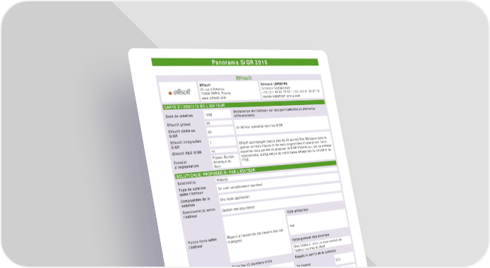 Panorama SIGR 2016 Effisoft Effisoft Edouard LEFEBVRE 26 rue d'Athènes Directeur Opérationnel 75009 PARIS, France +33 (0)1 42 93 72 52 / +33 (0)6 61 36 87 79 www.effisoft.com [email protected] CARTE D’IDENTITE DE L’EDITEUR Date de création 1990 Déclaration de l’éditeur sur ses particularités et éléments différenciants Effectif global 99 Effectif dédié au 99 Un éditeur spécialisé dans les SIGR SIGR Effectif intégration 7 SIGR Effisoft accompagne depuis plus de 20 ans les Risk Managers dans la Effectif R&D SIGR 44 gestion de leurs risques et de leurs programmes d'assurances. Cette expertise nous permet de proposer le SIGR Webrisk qui, par sa richesse Zone(s) France, Europe, fonctionnelle, a déjà séduit de nombreuses entreprises du CAC40 et du d’implantation Amerique du FTSE. Nord SOLUTION(S) PROPOSEE(S) PAR L’EDITEUR Solution(s) Webrisk Type de solution Un outil complètement standard selon l’éditeur Composition de la Une seule application solution Dominante(s) selon Gestion des assurances l’éditeur Club utilisateur Points forts selon Répond à l'ensemble des besoins des risk Non l’éditeur managers Hébergement des données Chez l'éditeur, chez un sous-traitant de l’éditeur ou chez le client Dans les 12 derniers mois Depuis la sortie de la solution Nombre de projets En France 4 En France 200 d’implémentation déclarés A l’étranger 5 A l’étranger 150 Secteurs d’activité Banque (11%), Assurance (3%), Industries Nombre moyen des projets et services (85%), Secteur public (1%) d’utilisateurs par solution De 101 à 200 implémentés Couverture des axes fonctionnels* Couverture des axes techniques* Assurance Intelligence 4,0 Gestion des économique 3,5 incidents 3,0 Qualité 2,5 Gestion de 2,0 crise et PCA 1,5 1,0 0,5 Maîtrise des Gouvernance 0,0 risques Gestion des Cartographie actions des risques Conformité Audit Contrôle interne (*) Les résultats retranscrits sur cette fiche sont conformes aux réponses fournies par l’éditeur Panorama SIGR 2016 – Copyright © 2016 AMRAE, en partenariat avec EY 37 / 77
