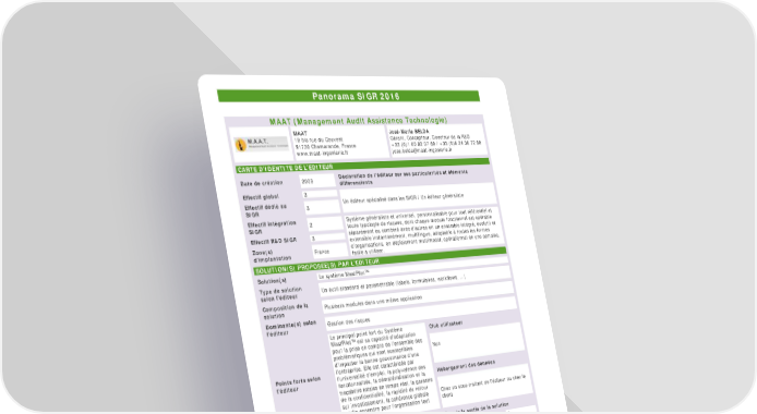 Panorama SIGR 2016 MAAT (Management Audit Assistance Technologie) MAAT José-Marie BELDA 19 bis rue du Couvent Gérant, Concepteur, Directeur de la R&D 91730 Chamarande, France +33 (0)1 60 82 07 89 / +33 (0)6 24 36 72 80 www.maat-ingenierie.fr [email protected] CARTE D’IDENTITE DE L’EDITEUR Date de création 2006 Déclaration de l’éditeur sur ses particularités et éléments différenciants Effectif global 3 Effectif dédié au 3 Un éditeur spécialisé dans les SIGR / Un éditeur généraliste SIGR Effectif intégration 2 Système généraliste et universel, personnalisable pour tout référentiel et SIGR toute typologie de risques, dont chaque module fonctionnel est opérable Effectif R&D SIGR 3 séparément ou combiné avec d’autres en un ensemble intégré, évolutif et extensible instantanément, multilingue, adaptable à toutes les formes Zone(s) France d’organisations, en déploiement multimodal, opérationnel en une semaine, d’implantation facile à utiliser. SOLUTION(S) PROPOSEE(S) PAR L’EDITEUR Solution(s) Le système MaatPilot™ Type de solution Un outil standard et paramétrable (labels, formulaires, workflows, ...) selon l’éditeur Composition de la Plusieurs modules dans une même application solution Dominante(s) selon Gestion des risques l’éditeur Le principal point fort du Système Club utilisateur MaatPilot™ est sa capacité d’adaptation pour la prise en compte de l’ensemble des problématiques qui sont susceptibles Non d’impacter la bonne gouvernance d’une Points forts selon l’entreprise. Elle est caractérisée par l’éditeur l’universalité d’emploi, la polyvalence des Hébergement des données fonctionnalités, la dématérialisation et la traçabilité totales en temps réel, la garantie de la confidentialité, la rapidité du retour Chez un sous-traitant de l’éditeur ou chez le sur investissement, la cohérence globale client qu’elle engendre pour l’organisation tout entière. Dans les 12 derniers mois Depuis la sortie de la solution Nombre de projets En France 2 En France 6 d’implémentation déclarés A l’étranger 0 A l’étranger 0 Secteurs d’activité Banque (5%), Assurance (5%), des projets Industries et services (60%), Secteur Nombre moyen De 6 à 50 implémentés public (10%), Autres (20%) d’utilisateurs par solution Couverture des axes fonctionnels* Couverture des axes techniques* (*) Les résultats retranscrits sur cette fiche sont conformes aux réponses fournies par l’éditeur 52 / 77 Panorama SIGR 2016 – Copyright © 2016 AMRAE, en partenariat avec EY