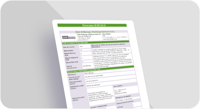 Panorama SIGR 2016 Click-N-Manage (Challenge Optimum S.A.) Click-N-Manage (Challenge Optimum) David BALME 3 rue des Plantaporrêts CEO 1205 Geneva, Suisse + 41 (0) 227 381 311 / + 41 (0) 788 926 813 www.optimum.ch [email protected] CARTE D’IDENTITE DE L’EDITEUR Date de création 1994 Déclaration de l’éditeur sur ses particularités et éléments différenciants Effectif global 10 Un éditeur spécialisé sur certaines catégories de risques (Qualité, Effectif dédié au 6 Santé-sécurité Environnement, Sécurité de l'information, Actifs) / Un SIGR éditeur spécialisé dans les SIGR / Un éditeur généraliste Effectif intégration 3 Challenge Optimum S.A., établie à Genève en 1994, est spécialisée SIGR dans la construction, le suivi et l’optimisation des systèmes de Effectif R&D SIGR 3 management. Elle a rejoint le groupe Worms & Cie en 2014. Aujourd’hui basé à Hong Kong, le groupe est spécialisé dans les essais Zone(s) en laboratoire, l’inspection, le management du risque et la certification d’implantation Asie Pacifique dans les secteurs des biens d’équipement de la maison, de la personne et des produits de santé. . SOLUTION(S) PROPOSEE(S) PAR L’EDITEUR Solution(s) Click-N-Manage Type de solution Une boite à outils paramétrable selon l’éditeur Composition de la Une seule application solution Dominante(s) selon Gestion des assurances l’éditeur Club utilisateur Outil intégré de description et Oui (1 réunion par an) Points forts selon d'optimisation du SIGR (processus, Créé en 2011 l’éditeur procédures, tâches, risques, indicateurs, Administré par l'éditeur documents, contrôles, habilitations, actions d'amélioration et descriptifs de fonction). Hébergement des données Chez l'éditeur, ou chez le client Dans les 12 derniers mois Depuis la sortie de la solution Nombre de projets En France 0 En France 1 d’implémentation déclarés A l’étranger 10 A l’étranger 30 Secteurs d’activité Banque (10%), Industries et services Nombre moyen des projets (80%), Secteur public (10%) d’utilisateurs par solution De 51 à 100 implémentés Couverture des axes fonctionnels* Couverture des axes techniques* Assurance Intelligence 4,0 Gestion des Acces économique 3,5 incidents 4,0 3,0 Workflows 3,5 Architecture 2,5 Gestion de 3,0 Qualité 2,0 crise et PCA 2,5 1,5 Reportings 2,0 Devise 1,0 1,5 0,5 Maîtrise des 1,0 Gouvernance 0,0 risques 0,5 0,0 Personnalisation Documentation Gestion des Cartographie actions des risques Organisation Export Conformité Audit Contrôle Langue Import interne (*) Les résultats retranscrits sur cette fiche sont conformes aux réponses fournies par l’éditeur 34 / 77 Panorama SIGR 2016 – Copyright © 2016 AMRAE, en partenariat avec EY