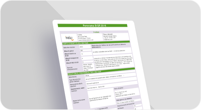 Panorama SIGR 2016 Ivalua Ivalua Thierry SALAUN 69 rue de Paris General manager Indicia 91400 Orsay, France +33 (0)1 64 86 20 34 www.indicia-solution.com [email protected] CARTE D’IDENTITE DE L’EDITEUR Date de création 2000 Déclaration de l’éditeur sur ses particularités et éléments différenciants Effectif global 200 Effectif dédié au 15 Un éditeur spécialisé dans les SIGR / Un éditeur généraliste SIGR Effectif intégration 5 SIGR Ivalua est un éditeur international qui intervient sur le reporting extra- Effectif R&D SIGR 5 financier au sens large. Notre solution Indicia est utilisée par des grands groupes pour cartographier leurs risques, auto-évaluer les référentiels France, Europe, d'entreprises et consolider les plans de remédiation. Notre solution se Zone(s) Amerique du configure pour répondre à des besoins très divers. Notre société d’implantation Nord, Amerique supporte environ 200 clients dans le monde. du Sud SOLUTION(S) PROPOSEE(S) PAR L’EDITEUR Solution(s) Indicia Type de solution Un outil standard et paramétrable (labels, formulaires, workflows, ...) selon l’éditeur Composition de la Une seule application solution Dominante(s) selon Contrôle Interne - Conformité l’éditeur Club utilisateur Oui (2 réunion par an) Points forts selon Sa configuration et son adaptation aux Créé en 2010 l’éditeur spécificités de chaque entreprise Administré par l'éditeur et des clients Hébergement des données Chez un sous-traitant de l’éditeur Nombre de projets Dans les 12 derniers mois Depuis la sortie de la solution d’implémentation En France 5 En France 10 déclarés A l’étranger 7 A l’étranger 20 Secteurs d’activité Banque (20%), Industries et services Nombre moyen des projets (70%), Secteur public (10%) d’utilisateurs par solution De 101 à 200 implémentés Couverture des axes fonctionnels* Couverture des axes techniques* (*) Les résultats retranscrits sur cette fiche sont conformes aux réponses fournies par l’éditeur 46 / 77 Panorama SIGR 2016 – Copyright © 2016 AMRAE, en partenariat avec EY