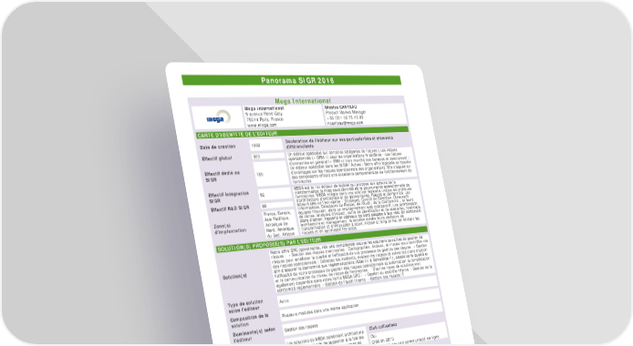 Panorama SIGR 2016 Mega International Mega International Nicolas CANTEAU 9 avenue René Coty Product Market Manager 75014 Paris, France +33 (0)1 42 75 40 23 www.mega.com [email protected] CARTE D’IDENTITE DE L’EDITEUR Date de création 1992 Déclaration de l’éditeur sur ses particularités et éléments différenciants Effectif global 300 Un éditeur spécialisé sur certaines catégories de risques (-Les risques opérationnels (« ORM ») pour les organisations financières -Les risques d’entreprise en général (« ERM ») hors marché des banques et assurances) / Effectif dédié au 180 Un éditeur spécialisé dans les SIGR / Autres : Notre offre logicielle se focalise SIGR d’avantages sur les risques opérationnels des organisations. Elle s’appuie sur des composants offrant une excellente compréhension du fonctionnement de l’entreprise Effectif intégration MEGA est le 1er éditeur de logiciel qui propose aux acteurs de la SIGR 92 transformation la mise sous contrôle de la gouvernance opérationnelle de l'entreprise. MEGA intègre dans une solution logicielle unique les pratiques Effectif R&D SIGR 88 d’architecture d’entreprise et de gouvernance, risques et conformité. Les acteurs clés de l'entreprise - Stratèges, Comité de Direction, Directeurs France, Europe, Informatique, Directeurs du Risque, de l'Audit, de la Conformité... et leurs équipes trouvent, dans un environnement web collaboratif, une combinaison Zone(s) Asie Pacifique, de cartes, analyses d'impact, outils de planification et de scenarios, roadmaps, Amerique du plans d'action, rapports et tableaux de bord adaptés à leur rôle. En combinant d’implantation Nord, Amerique architecture et management, la solution éclaire leurs décisions de du Sud, Afrique transformation et d'innovation à court, moyen et long terme, en limitant les risques et en optimisant les coûts. SOLUTION(S) PROPOSEE(S) PAR L’EDITEUR Notre offre GRC (governance, risk and compliance) couvre les solutions suivantes de gestion de risques : - Gestion des risques d'entreprise : Cartographiez, évaluez, et mettez sous contrôles vos risques pour améliorer la qualité et l'efficacité de vos processus de gestion des risques. - Gestion des risques opérationnels : Collectez les incidents, évaluez les risques et suivez les plans d’action Solution(s) afin d’assurer la conformité aux réglementations (Bâle III & Solvabilité II), améliorer la qualité et l’efficacité de votre processus de gestion des risques opérationnels et automatiser la consolidation et la communication du niveau de risque de l’entreprise. D'autres types de solutions sont également disponible dans notre l'offre MEGA GRC : - Gestion du contrôle interne - Gestion de la conformité règlementaire - Gestion de l'audit interne - Gestion des risques IT Type de solution Autre selon l’éditeur Composition de la Plusieurs modules dans une même application solution Dominante(s) selon Gestion des risques l’éditeur Les solutions de MEGA combinent architecture Club utilisateur et management afin de supporter à la fois les Oui activités quotidiennes, déployées auprès de Créé en 2010 Points forts selon tous les utilisateurs impliqués (gestion du Administré par une communauté en ligne l’éditeur risque, conformité...) et les activités de transformation et de planification à long terme Hébergement des données (architecture d'une offre, enrichissement Chez un sous-traitant de l’éditeur ou chez le stratégique, exécution et alignement...). client Nombre de projets Dans les 12 derniers mois Depuis la sortie de la solution d’implémentation En France 11 En France 78 déclarés A l’étranger 15 A l’étranger 69 Secteurs d’activité Banque (44%), Assurance (14%), Industries Nombre moyen des projets et services (34%), Secteur public (6%), d’utilisateurs par solution De 501 à 1000 implémentés Autres (2%) Couverture des axes fonctionnels* Couverture des axes techniques* (*) Les résultats retranscrits sur cette fiche sont conformes aux réponses fournies par l’éditeur 54 / 77 Panorama SIGR 2016 – Copyright © 2016 AMRAE, en partenariat avec EY