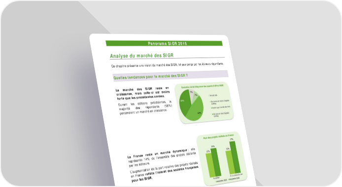Panorama SIGR 2016 Analyse du marché des SIGR Ce chapitre présente une vision du marché des SIGR, tel que perçu par les éditeurs répondants. Quelles tendances pour le marché des SIGR ? Le marché des SIGR reste en croissance, mais celle-ci est moins forte que les précédentes années. Durant les éditions précédentes, la majorité des répondants (56%) percevaient un marché en croissance. La France reste un marché dynamique ; elle représente 14% de l’ensemble des projets déclarés par les éditeurs. L’augmentation de la part relative des projets réalisés en France reflète l’intérêt des sociétés françaises pour les SIGR. Comme l’année précédente, 2/3 des entreprises faisant l’acquisition d’un SIGR restent des grandes structures. Le dynamisme du marché relevé précédemment semble donc toucher autant les grandes entreprises, que les petites et moyennes. Les organisations internationales restent les organisations les plus représentées (58%). Panorama SIGR 2016 – Copyright © 2016 AMRAE, en partenariat avec EY 11 / 77
