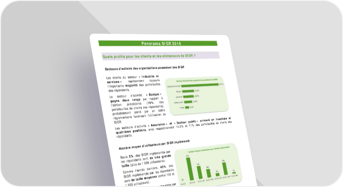 Panorama SIGR 2016 Quels profils pour les clients et les utilisateurs de SIGR ? Secteurs d’activité des organisations possédant des SIGR Les clients du secteur « Industrie et services » représentent toujours l’importante majorité des portefeuilles des répondants. Le secteur d’activité « Banque » gagne deux rangs par rapport à l’édition précédente (16% des portefeuilles de clients des répondants), probablement porté par un cadre réglementaire favorisant l’utilisation de SIGR. Les secteurs d’activité « Assurance » et « Secteur public » arrivent en troisième et quatrième positions, avec respectivement 14,5% et 11% des portefeuilles de clients des répondants. Nombre moyen d’utilisateurs par SIGR implémenté r Seuls 2% des SIGR implémentés pa les répondants sont de très grande taille (plus de 1 000 utilisateurs). Comme l’année dernière, 40% des SIGR implémentés par les répondants sont de taille moyenne (entre 100 et 1 000 utilisateurs). Enfin 58% des SIGR implémentés pa r les répondants sont de petite taille (moins de 100 utilisateurs). Ce constat est à mettre en perspective avec le fait que 68% des projets sont implémentés dans des grandes structures (cf. page précédente) : ainsi, même dans les grandes structures, les SIGR concernent en général moins de 1 000 utilisateurs. Existence d’un club utilisateur Existence d’un club utilisateur Il est désormais très commun que les éditeurs proposent un club utilisateur pour 14% leurs clients (+3% par rapport à l’édition précédente) 86% Oui Non 12 / 77 Panorama SIGR 2016 – Copyright © 2016 AMRAE, en partenariat avec EY