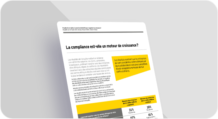 8 Les résultats de l’enquête mettent en évidence une vérité très naturelle : les clients, partenaires, investisseurs, préfèrent travailler avec des entreprises dites éthiques, dignes de confiance. Les répondants travaillant dans des entreprises réputées comme ayant des normes éthiques élevées sont aussi ceux qui ont le plus tendance à constater une hausse des revenus. Certains collaborateurs continuent à considérer la compliance comme un frein pouvant nuire à la compétitivité. Par exemple, un cinquième des répondants estime que le respect trop rigoureux des politiques anti-corruption rend leur entreprise moins compétitive. Mais de nombreux résultats clés indiquent le contraire. Le respect de la conformité et le développement sont deux notions qui vont de pair. Les résultats montrent que les entreprises qui ont connu une hausse de leur chiffre d’affaires au cours des deux dernières années sont davantage perçues comme éthiques par leurs collaborateurs, qu’ils dépendent du siège ou d’une filiale. Cette corrélation a été observée dans bon nombre des réponses à l’enquête. Réponses des entreprises dont le chiffre d’affaires a augmenté Réponses des entreprises dont le chiffre d’affaires a diminué Comment jugeriez-vous les normes éthiques de votre entreprise dans sa conduite des affaires ? 31 % Très bonnes 18 % Très bonnes Êtes-vous convaincu que les opérations de votre entreprise répondent aux mêmes normes éthiques dans tous les pays ? 62 % Plutôt convaincu ou tout à fait convaincu 41 % Plutôt convaincu ou tout à fait convaincu Les pratiques non éthiques restent-elles souvent inconnues du siège ? 19 % Oui 28 % Oui Les normes éthiques de votre entreprise se sont-elles améliorées ou au contraire se sont-elles détériorées au cours des deux dernières années, ou bien n’ont-elles pas changé ? 43 % Améliorées 20 % Améliorées Quel effet l’activité de réglementation dans votre secteur a-t-elle eu sur les normes éthiques dans votre entreprise ? 30 % Effet positif 14 % Effet positif Quel effet l’activité de réglementation au cours des deux dernières années a-t-elle eu sur les résultats de votre entreprise ? 26 % Effet positif 8 % Effet positif Base : Entreprises ayant indiqué avoir constaté une augmentation du chiffre d’affaires (2 132) ; Entreprises ayant indiqué avoir constaté une baisse du chiffre d’affaires (665) La compliance est-elle un moteur de croissance ? Les résultats montrent que les entreprises qui sont considérées comme éthiques par leurs collaborateurs sont plus susceptibles d’avoir enregistré une hausse de leur chiffre d’affaires.