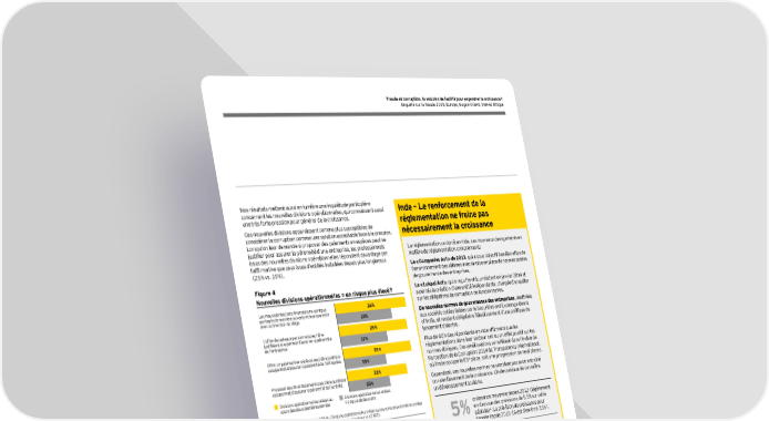 5 Nos résultats mettent aussi en lumière une inquiétude particulière concernant les nouvelles divisions opérationnelles, qui connaissent aussi une très forte pression pour générer de la croissance. Ces nouvelles divisions apparaissent comme plus susceptibles de considérer la corruption comme une solution acceptable face à la pression. Lorsqu’on leur demande si proposer des paiements en espèces peut se justifier pour assurer la pérennité d’une entreprise, les professionnels issus des nouvelles divisions opérationnelles répondent davantage par l’affirmative que ceux issus d’entités installées depuis plus longtemps (25 % vs. 15 %). Figure 4 Nouvelles divisions opérationnelles = un risque plus élevé ? Les mauvais résultats financiers ne sont pas partagés de manière ouverte et transparente avec la direction du siège L’offre de cadeaux personnels peut être justifiée si elle permet d’assurer la pérennité de l’entreprise Offrir un paiement en espèces peut être justifié si cela permet d’assurer la pérennité de l’entreprise Proposer des divertissements peut être justifié si cela permet d’assurer la pérennité de l’activité Divisions opérationnelles créées au cours des deux dernières années Divisions opérationnelles créées il y a plus de deux ans 17 % 25 % 25 % 15 % 22 % 26 % 20 % 15 % Base : Tous les participants (3 800) ; Divisions opérationnelles créées au cours des deux dernières années (936), Divisions opérationnelles créées depuis plus de deux ans (2 802) Autre facteur aggravant : le fait que les mauvais résultats ont moins tendance à être reportés par les nouvelles divisions opérationnelles – et que les pratiques non éthiques passent inaperçues : ► 26 % des participants issus des nouvelles divisions opérationnelles estiment que les mauvais résultats financiers ne sont pas partagés avec le siège de manière ouverte et transparente ; ► 21 % des participants indiquent que les pratiques non éthiques au sein de leur entreprise ne sont que rarement détectées par le siège. 21 % des participants s’accordent à dire que les pratiques non éthiques ne sont que rarement détectées par le siège. La réglementation se durcit en Inde. Les nouveaux changements en matière de réglementation comprennent : Le « Companies Act » de 2013 , qui a pour objectif l’amélioration de l’environnement des affaires avec la mise en place de normes solides de gouvernance des entreprises. Le « Lokpal Act » , qui a reçu l’aval du président en janvier 2014 et a permis la création d’une entité indépendante, chargée d’enquêter sur les allégations de corruption de fonctionnaires. De nouvelles normes de gouvernance des entreprises , destinées aux sociétés cotées listées par le Securities and Exchange Board of India, et rendant obligatoire l’établissement d’une politique de lancement d’alertes. Plus de 60 % des répondants en Inde affirment que les réglementations dans leur secteur ont eu un effet positif sur les normes éthiques. Ces améliorations se reflètent dans l’Indice de Perception de la Corruption 2014 de Transparency International, où l’Inde occupe la 85 e place, soit une progression de neuf places. Cependant, ces nouvelles normes ne semblent pas avoir entraîné un ralentissement de la croissance. L’Inde continue de connaître un développement soutenu. 5 % croissance moyenne depuis 2012 (légèrement en-dessous des prévisions de 5,5% sur cette période) 1 . La prévision de croissance pour l’année fiscale 2015–16 est d’environ 7,5% 2 . 89 % des répondants en Inde indiquent que leur chiffre d’affaires a augmenté au cours des deux dernières années. 96 % des participants en Inde sont optimistes quant aux opportunités de développement dans leur pays. 1 Source : Fonds Monétaire International, base de données des perspectives de l’économie mondiale 2 Source : Groupe de la Banque mondiale, actualités sur le développement de l’Inde, avril 2015 Inde – Le renforcement de la réglementation ne freine pas nécessairement la croissance