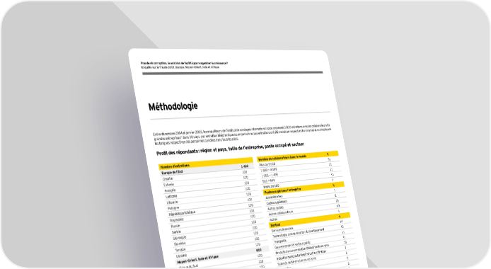 20 Méthodologie Entre décembre 2014 et janvier 2015, les enquêteurs de l’institut de sondages international Ipsos ont mené 3 800 entretiens avec les collaborateurs de grandes entreprises* dans 38 pays, par entretien téléphonique ou en personne. Les entretiens ont été menés en respectant l’anonymat et en employant les langues respectives des personnes sondées dans tous les pays. Profil des répondants : région et pays, taille de l’entreprise, poste occupé et secteur Nombre d’entretiens Europe de l’Est 1 400 Croatie 100 Estonie 100 Hongrie 100 Lettonie 100 Lituanie 100 Pologne 100 République tchèque 100 Roumanie 100 Russie 100 Serbie 100 Slovaquie 100 Slovénie 100 Turquie 100 Ukraine 100 Moyen-Orient, Inde et Afrique 800 Afrique du Sud 100 Arabie Saoudite 100 EAU 100 Egypte 100 Inde 100 Kenya 100 Nigeria 100 Oman 100 Europe de l’Ouest 1 600 Allemagne 100 Autriche 100 Belgique 100 Danemark 100 Espagne 100 Finlande 100 France 100 Grèce 100 Irlande 100 Italie 100 Norvège 100 Pays-Bas 100 Portugal 100 Royaume-Uni 100 Suède 100 Suisse 100 Nombre de collaborateurs dans le monde % Plus de 5 000 51 1 500 — 4 999 21 1 000 — 1 499 11 500 — 999 10 Moins de 500 7 Poste occupé dans l’entreprise % Administrateur 1 Cadres supérieurs 8 Autres cadres 25 Autres collaborateurs 63 Autres 4 Secteur % Services financiers 14 Technologie, communication et divertissement 12 Transports 11 Gouvernement et secteur public 11 Produits de consommation/Détail/Vente en gros 10 Industrie manufacturière/Industrie chimique 7 Soins de santé et sciences de la vie 6 Immobilier 5 Industries d’extraction 3 Services professionnels 3 Energie et utilities 2 Autres secteurs 15 Dans le cadre de l’enquête, la mention « pays développés » fait référence aux pays suivants : Allemagne, Autriche, Belgique, Danemark, Espagne, Finlande, France, Grèce, Irlande, Italie, Norvège, Pays-Bas, Portugal, Royaume-Uni, Suède et Suisse. Les « pays à forte croissance », issus de la publication « Rapid-Growth Markets Forecast » de juillet 2014, incluent l’Afrique du Sud, l’Arabie Saoudite, l’Egypte, les Emirats arabes unis, l’Inde, le Nigeria, la Pologne, la République tchèque, la Russie, la Turquie et l’Ukraine. * Les grandes entreprises sont définies comme employant plus de 150, 250, 500, 1 000 ou 1 500 personnes dans le monde, en fonction du pays, ou telles que cotées sur un marché boursier, ou bien sont des multinationales.