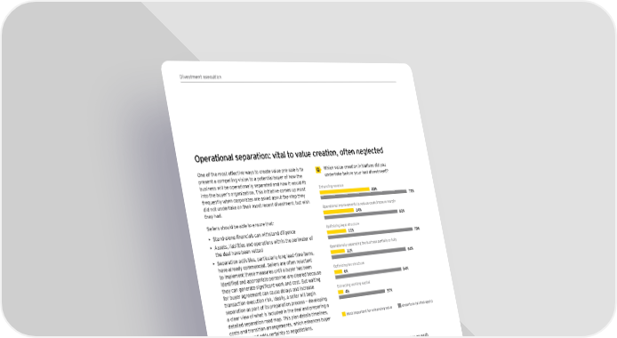 Divestment execution Operational separation: vital to value creation, often neglected One of the most effective ways to create value pre-sale is to Which value creation initiatives did you present a compelling vision to a potential buyer of how the undertake before your last divestment? business will be operationally separated and how it would fit into the buyer’s organization. This initiative comes up most Enhancing revenue frequently when corporates are asked about the step they 40% did not undertake on their most recent divestment, but wish 71% they had. Operational improvements to reduce costs/improve margin 24% Sellers should be able to ensure that: 60% • Stand-alone financials can withstand diligence Optimizing legal structure • Assets, liabilities and operations within the perimeter of 15% 70% the deal have been vetted Operationally separating the business partially or fully • Separation activities, particularly long lead-time items, 11% have already commenced. Sellers are often reluctant 61% to implement these measures until a buyer has been Optimizing tax structure identified and appropriate personnel are cleared because 6% they can generate significant work and cost. But waiting 54% for buyer agreement can cause delays and increase Extracting working capital transaction execution risk. Ideally, a seller will begin 4% separation as part of its preparation process — developing 37% a clear view of what is included in the deal and preparing a detailed separation road map. This plan details timelines, costs and transition arrangements, which enhances buyer Most important for enhancing value Undertook (all that apply) confidence and adds certainty to negotiations. Which step did you not do but now feel you Increase in likelihood of high performance on each would have benefited from the most? metric if value creation initiative is carried out Operationally separating the business partially or fully Enhancing revenue (e.g., product improvement or distribution expansion) 25% 43% Extracting working capital 57% 21% Operational improvements to reduce costs/improve margin 36% Operational improvements to reduce costs/improve margin 13% 18% Operationally separating the business partially or fully Optimizing tax structure 33% 17% 49% Enhancing revenue Optimizing tax structure 10% 15% 35% Optimizing legal structure Optimizing legal structure 9% 6% 46% Extracting working capital 2% 8% Price Timing 18