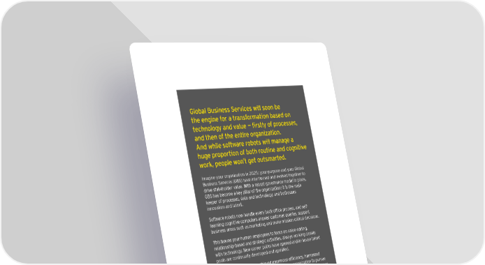 Global Business Services will soon be the engine for a transformation based on technology and value — firstly of processes, and then of the entire organization. And while software robots will manage a huge proportion of both routine and cognitive work, people won’t get outsmarted. Imagine your organization in 2025: your purpose and your Global Business Services (GBS) have intertwined and evolved together to drive stakeholder value. With a robust governance model in place, GBS has become a key pillar of the organization; it is the main keeper of processes, data and technology, and hothouses innovation and talent. Software robots now handle every back-office process, and self- learning cognitive computers answer customer queries, support business areas such as marketing and make mission-critical decisions. This leaves your human employees to focus on value-adding, relationship-based and strategic activities, always working closely with technology. New career paths have opened and in-house talent pools are continually developed and upskilled. The transformation has achieved enormous efficiency, harnessed automation and innovation, and enabled your organization to pursue ever-greater value — both financially and emotionally. You have leaner cost structures, greater competitiveness and agility, and more control over disruption. Your customers (whether employees, consumers or clients) enjoy exceptional service — deeper relationships, seamless interfaces and faster workflow. SS_Dublin_infographic.indd 2 23/05/2016 12:39:17